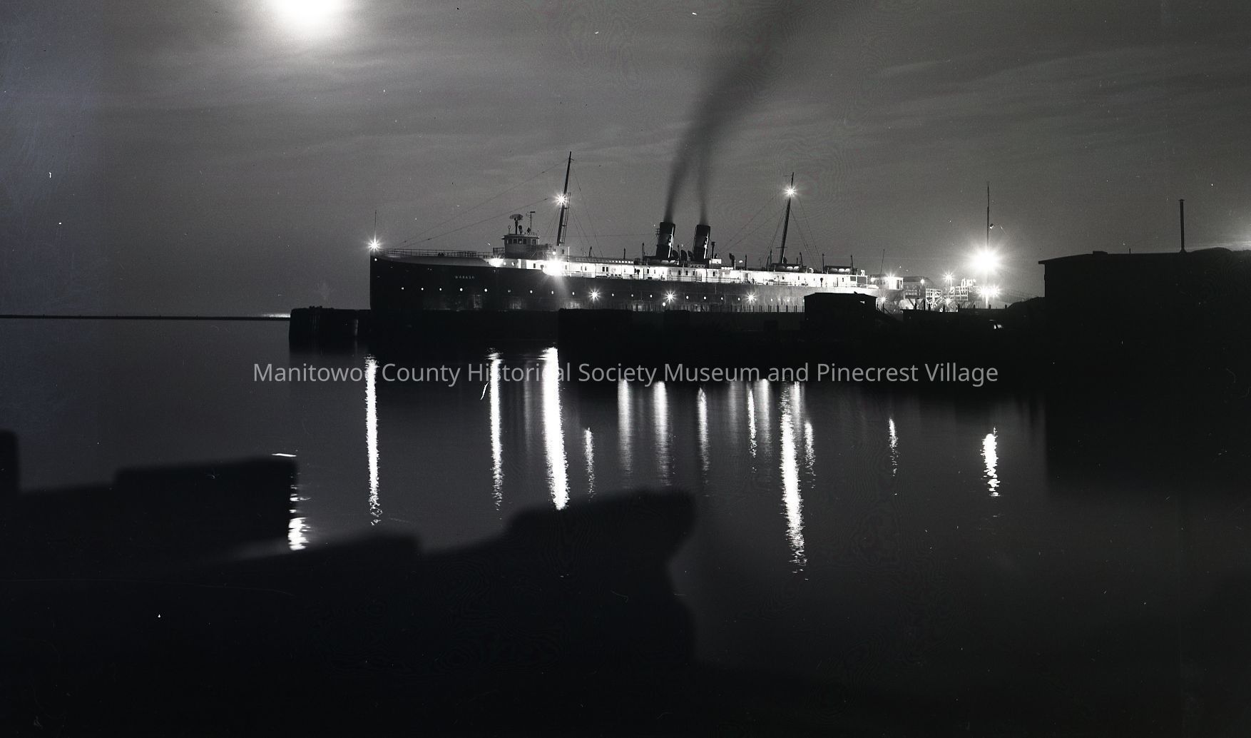 Carferry Wabash docked at lakefront slip in Manitowoc. Photo taken at night. Photograph taken on August 16th, 1951.Made/Created