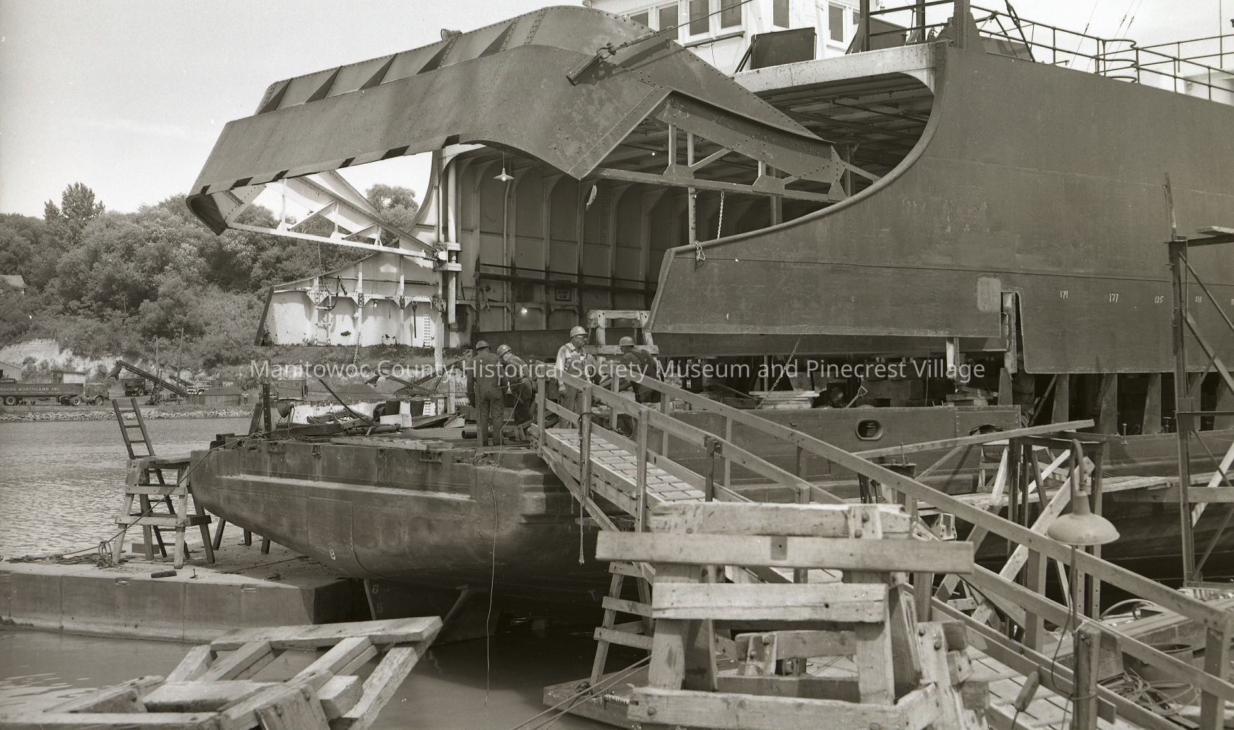 Stern of carferry Wabash at Manitowoc Shipbuilding having her car deck height increased. Photograph taken in June 1962.Made/Created