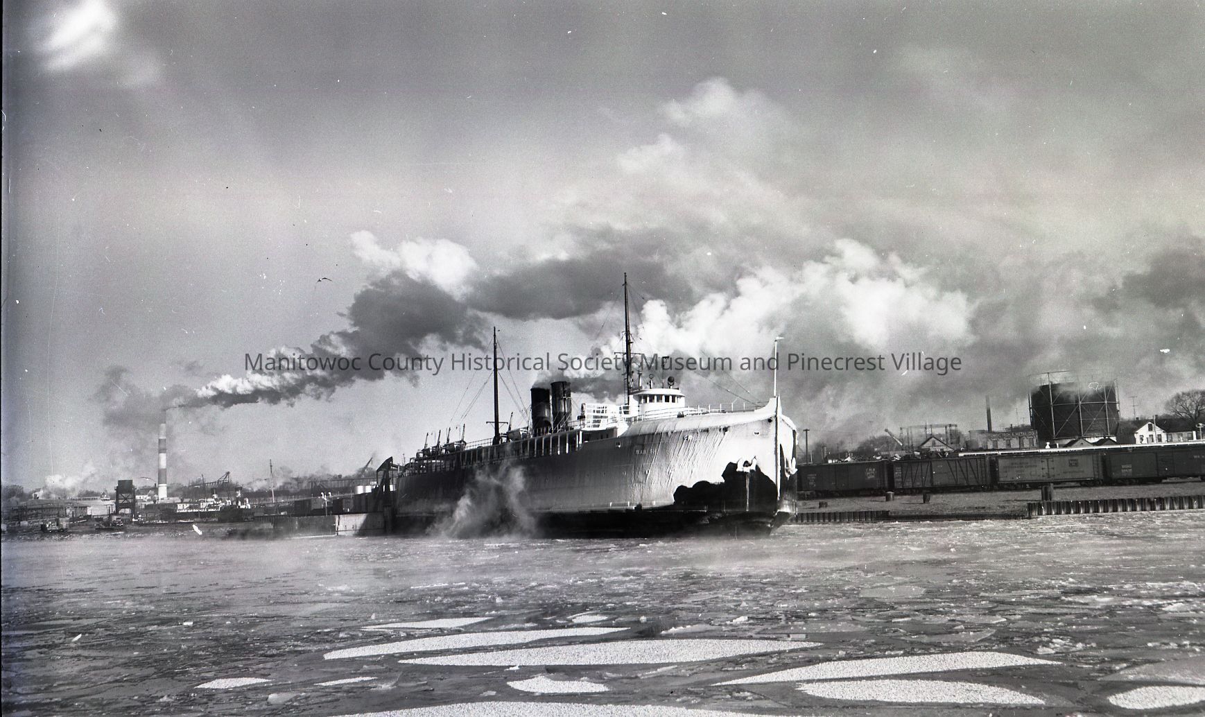 Carferry Wabash iced up after a lake crossing at Soo Line slip Manitowoc. At right is Soo Line RR yard and old tanks from Manitowoc Gas Works. Photograph taken on January 2nd, 1957.Made/Created