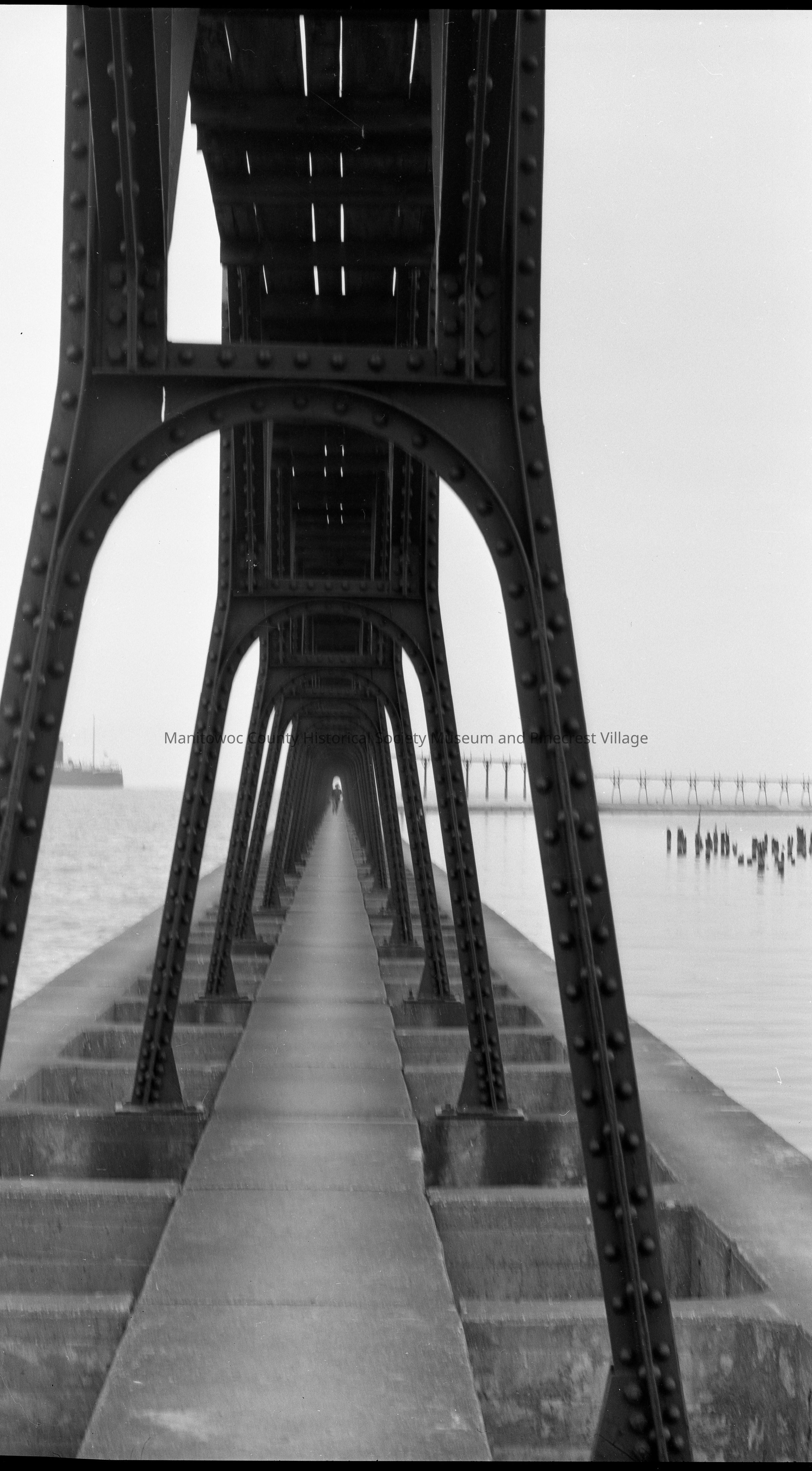 Underside of catwalk out to the lighthouse on the northside pier Manitowoc. Wooden pilings in water are remains of old piers from 1800's. Photograph taken on May 28h, 1956.Made/Created