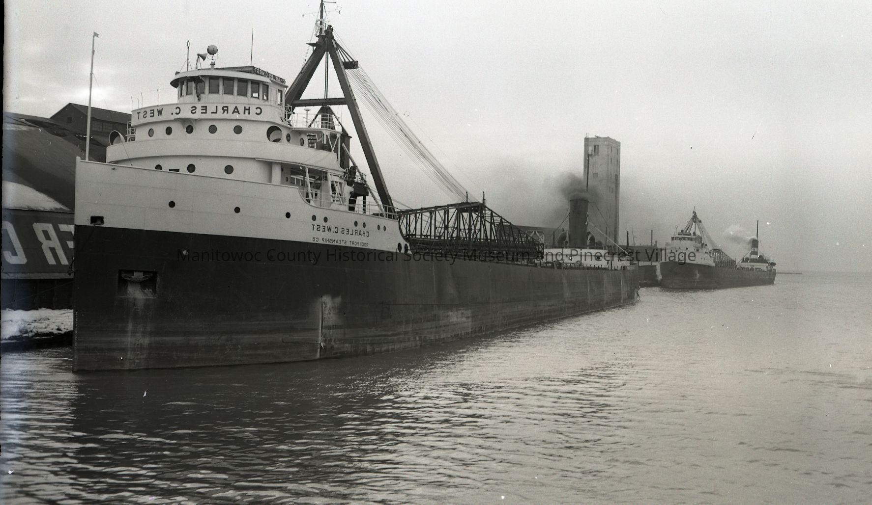 Charles C. West docked along Quay street at Spindler Coal shed. Boat behind may be old Adam E. Cornelius II. Photograph taken December 7th, 1947.Made/Created