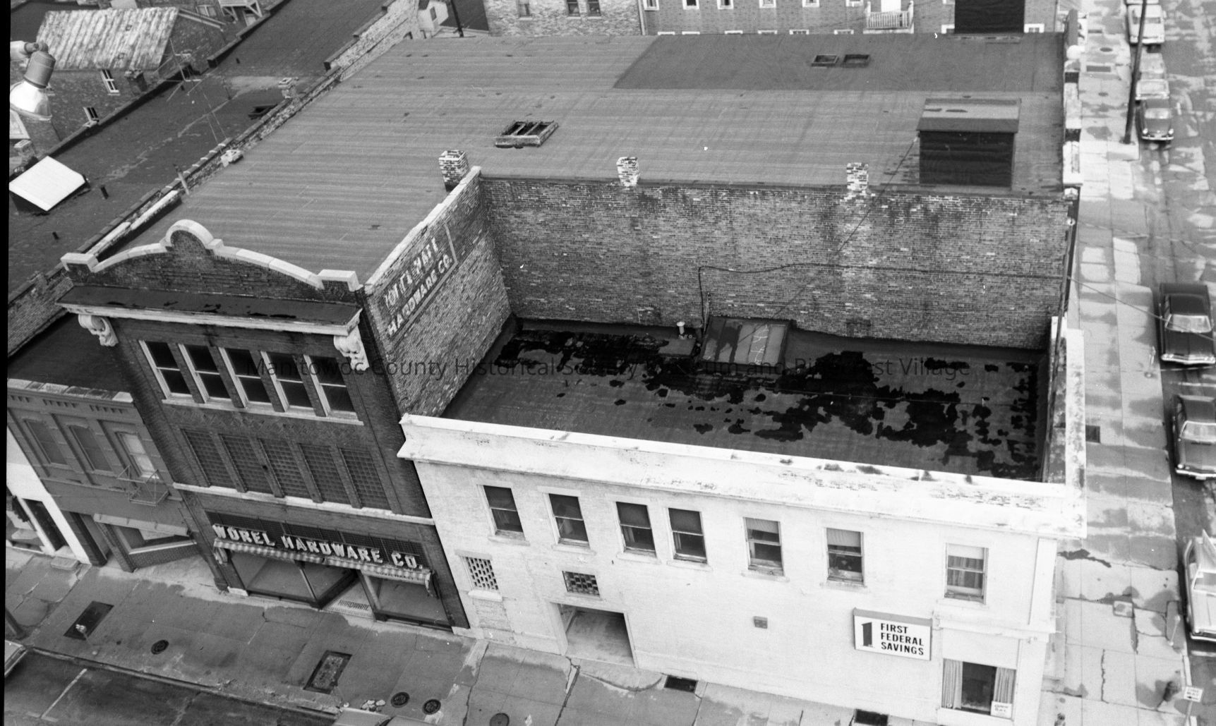 City of Manitowoc; birds-eye from roof of Hotel Manitowoc, 204 North 8th Street looking at First Federal Savings, 724 York; Worel Hardware, 205 and Ray's Barber Shop, 207 North 8th Street. York Street is at right. Photograph taken on May 21st, 1974.Made/Created