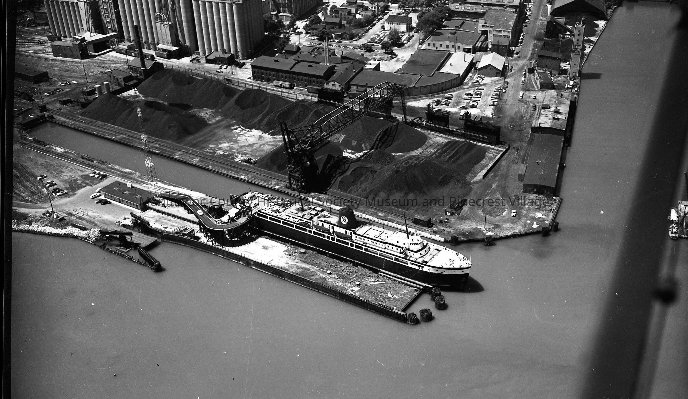 Aerial: Carferry "City of Midland" loading cars on upper deck at Manitowoc lakefront. Rahr Malting is upper left; Lakeside Packing upper center; Pauly Cheese at end of Quay Street at river mouth.