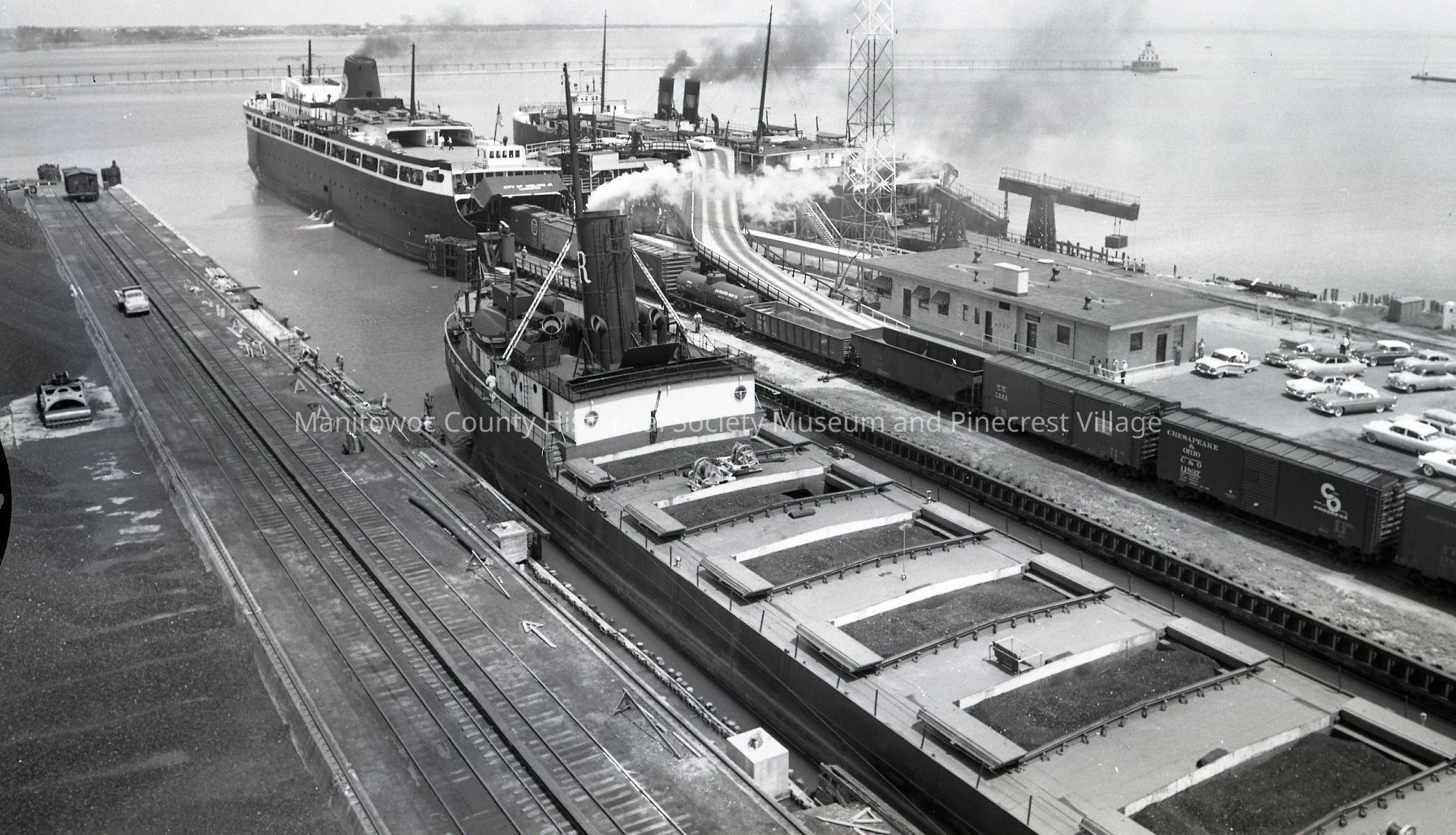Car ferry slip lakefront Manitowoc. Two car ferries loading; at left is City of Midland loading RR cars below and autos up ramp to upper deck; at right is the Wabash loading. At left is the Clemens Reiss in the C. Reiss slip. Photo taken from gantry crane at C. Reiss Coal. Photograph taken on July 2nd, 1956.Made/Created