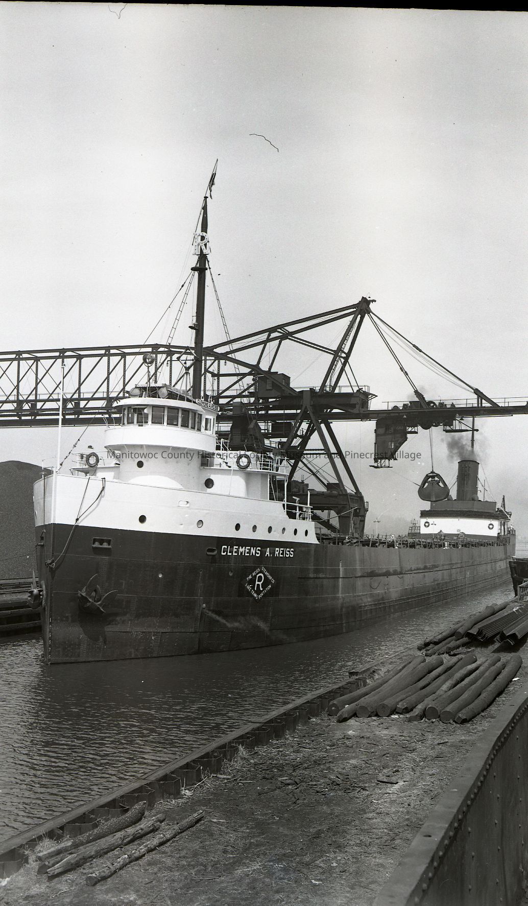 Clemens A. Reiss being unloaded by gantry crane at C. Reiss coaldock. This is the original Clemens A. Reiss built in 1901. Photograpg taken on April 25th, 1948.Made/Created