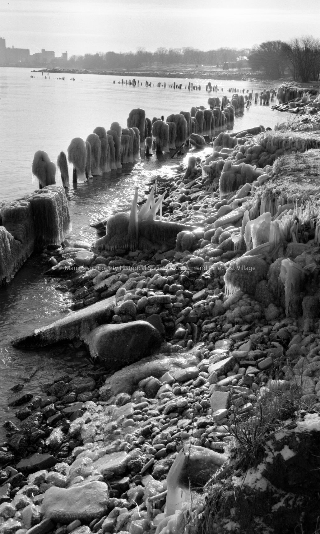 Ice forming on old lakefront wooden pilings along Cleveland Ave at Little Manitowoc River. Photograph taken on December 16th, 1968.Made/Created