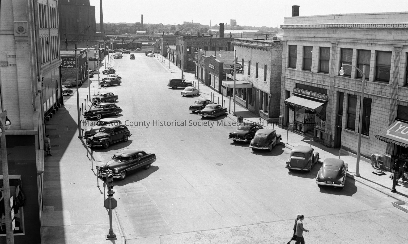 Birds-eye of Commercial Street Manitowoc from top of Koehler Jewelry Store, 13 North 8th Street looking west. At right is Hamilton Flowers, 102 North 8th. Spevacek Flooring, 804; Hoeffner Printing, 808; Glenn Inn, 810; Kortas Automotive, 818; Fritsch Studebaker, 824; Richards Iron Works, 904 and Ralph's Bar 924 Commercial Street. Notice angle parking. Photograph taken on May 26th, 1952.Made/Created