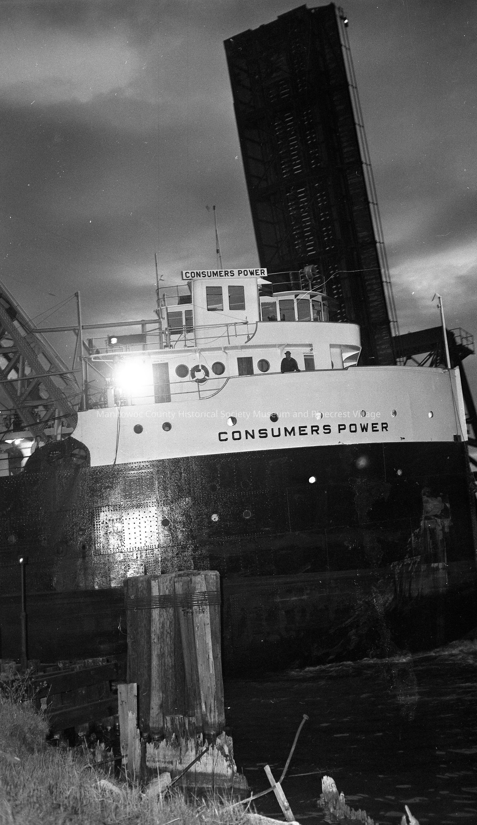 Lakeboat "Consumers Power" hits jacknife railroad bridge while coming out from Manitowoc