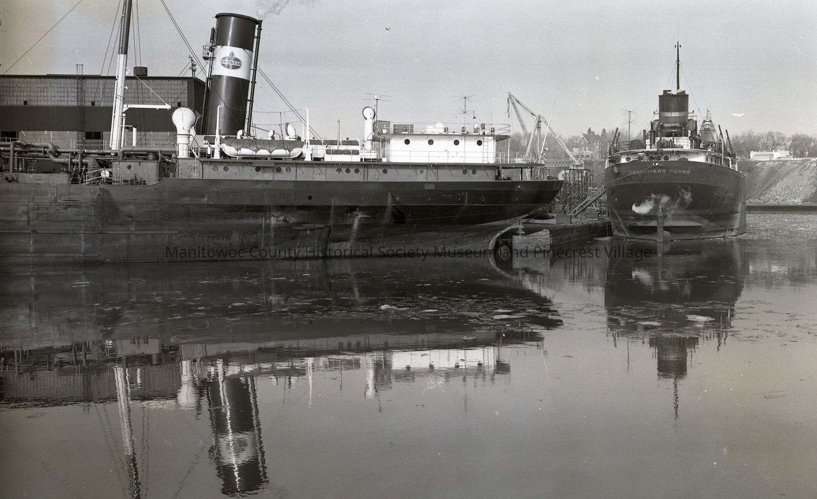 Consumers Power and a Standrad Oil tanker in winter lay-up at Manitowoc Shipbuilding. Photograph taken on December 9th, 1964.Made/Created