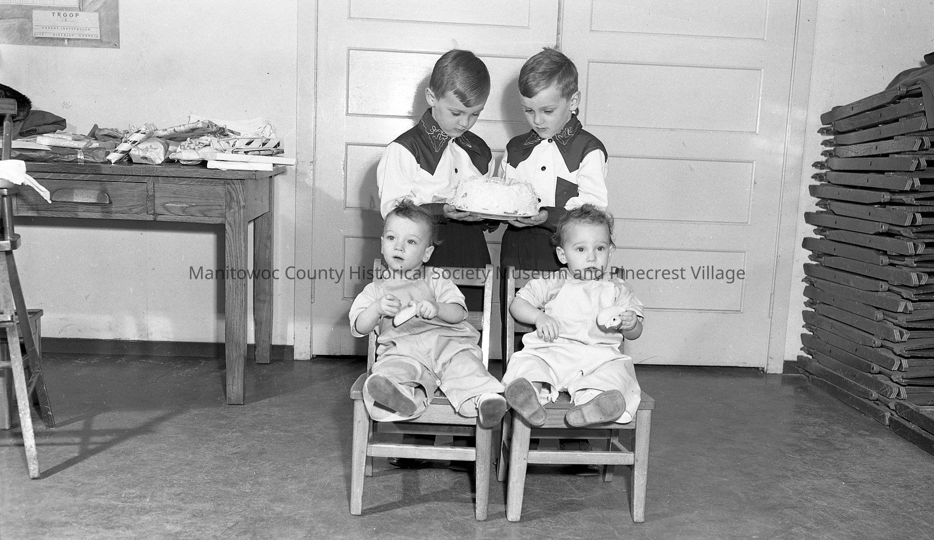 Custerdale twins of Mr & Mrs Frank Budreau Jr; Dennis Paul & Danny Paul standing; Larry Lee & Jackie Lee seated HTR April 4, 1950 page 1
