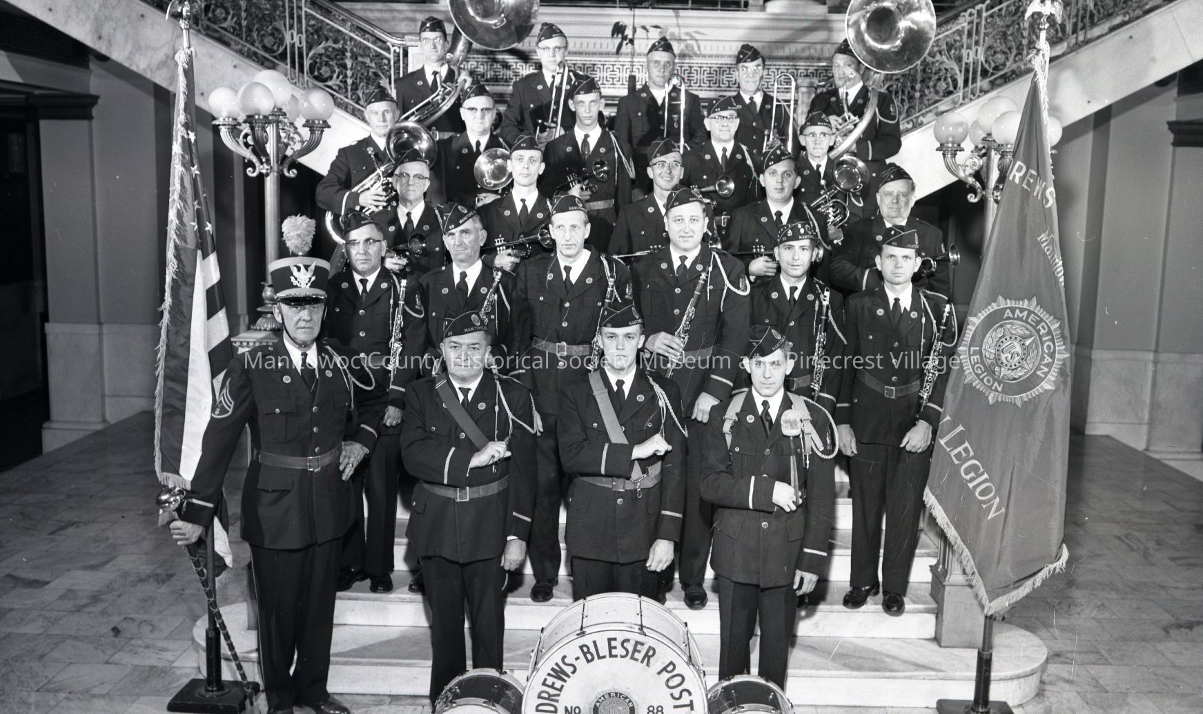 American Legion Band on the Manitowoc Courthouse interior steps. Drews-Bleser Post 88. Photograph taken in September 1956.