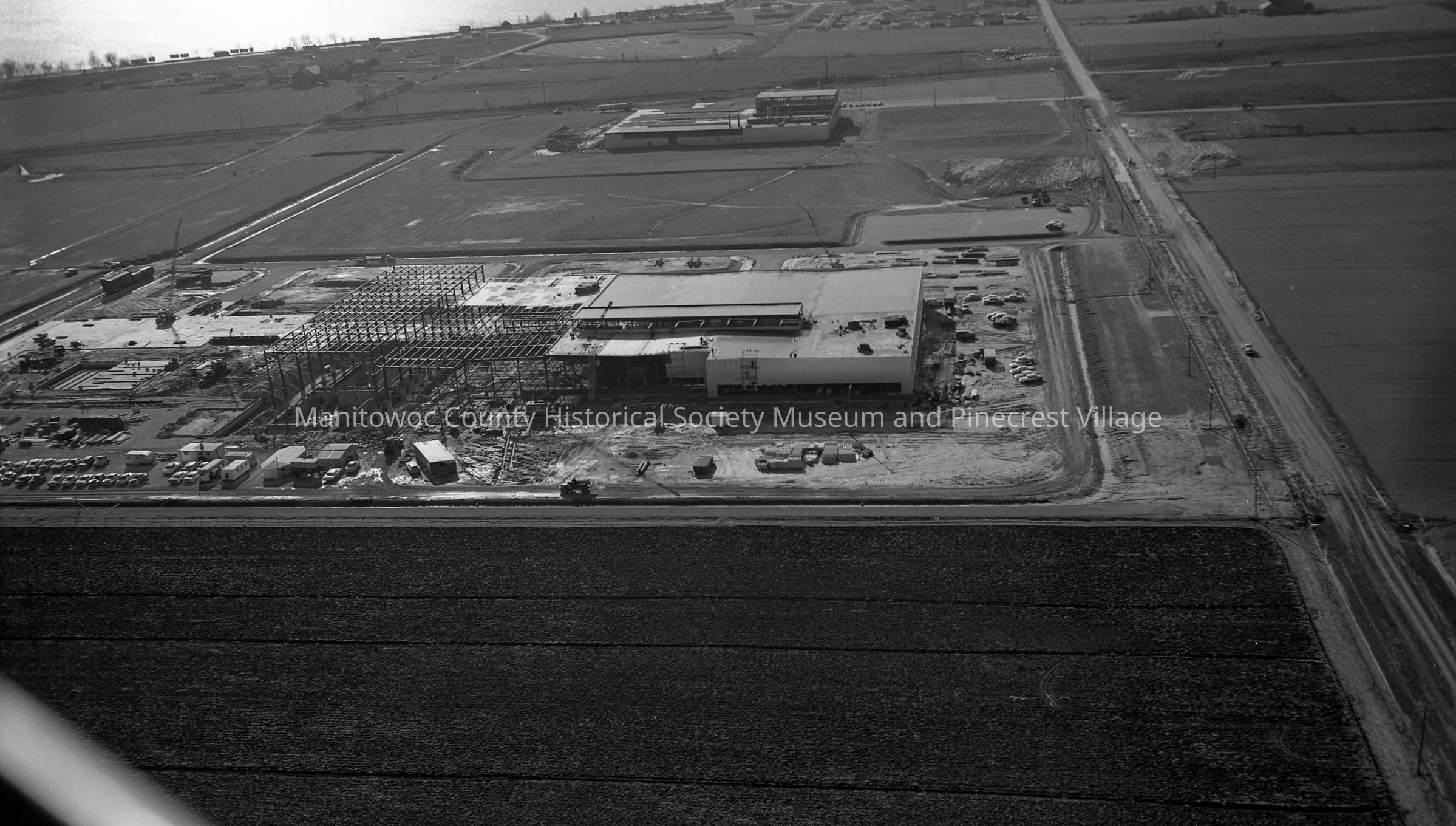 Aerial: Mirro rolling mill, Mirro Drive Manitowoc. Work in progress; road at right looking south is Mirro Drive. Just above is Mirro Plant #6.