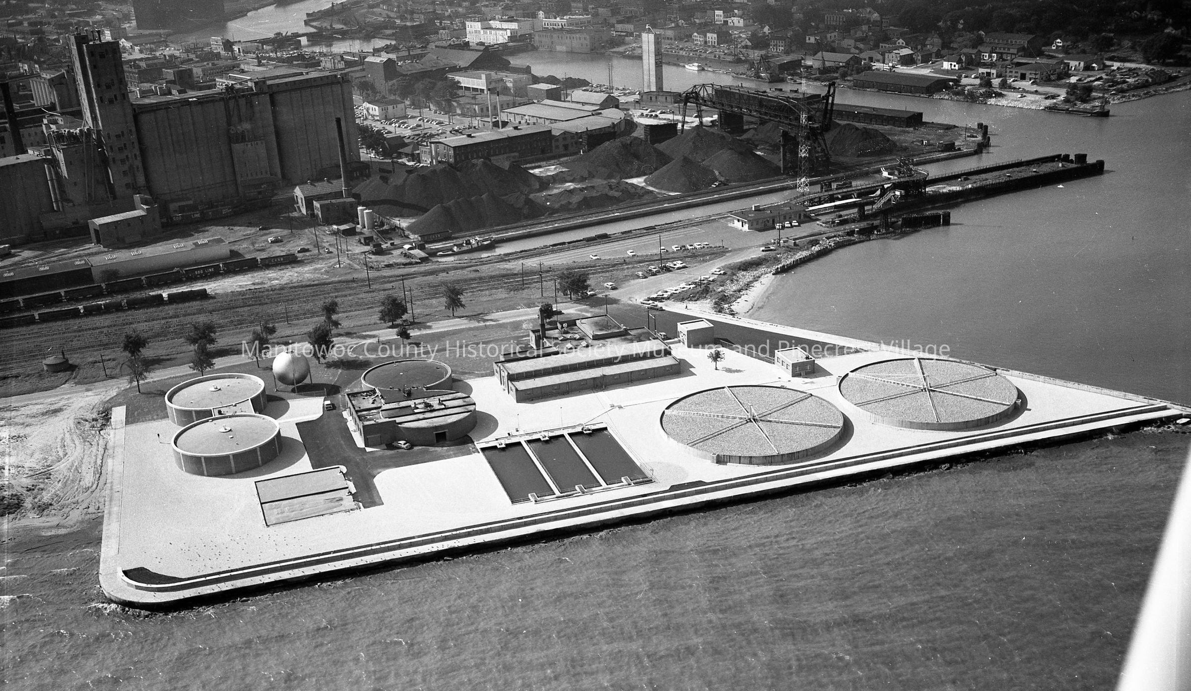 Aerial: Manitowoc Sewage Disposal Plant at lakefront looking west