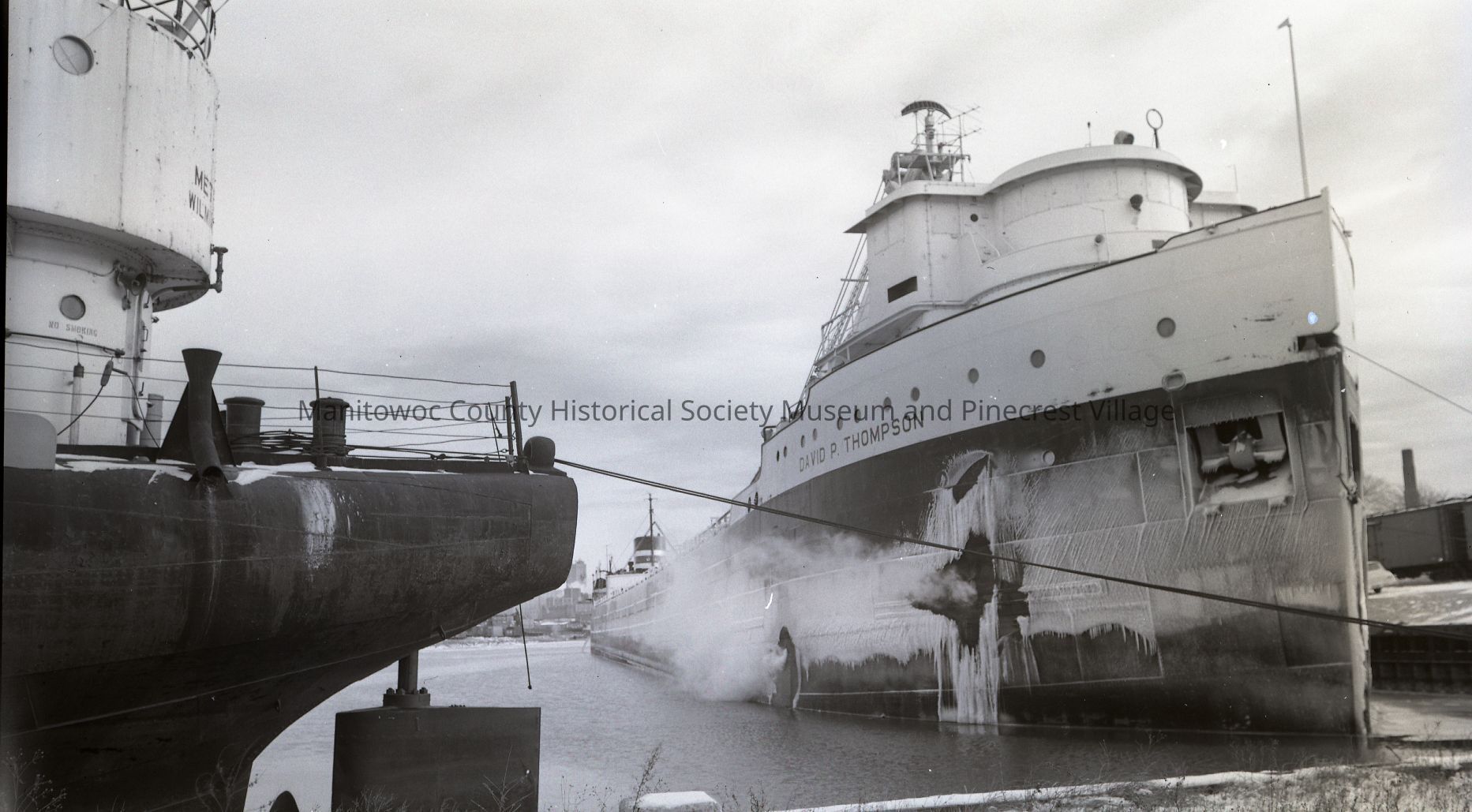 David P. Thompson docked at Manitowoc Shipbuilding for winter lay-up. Photograph taken in December 1962.