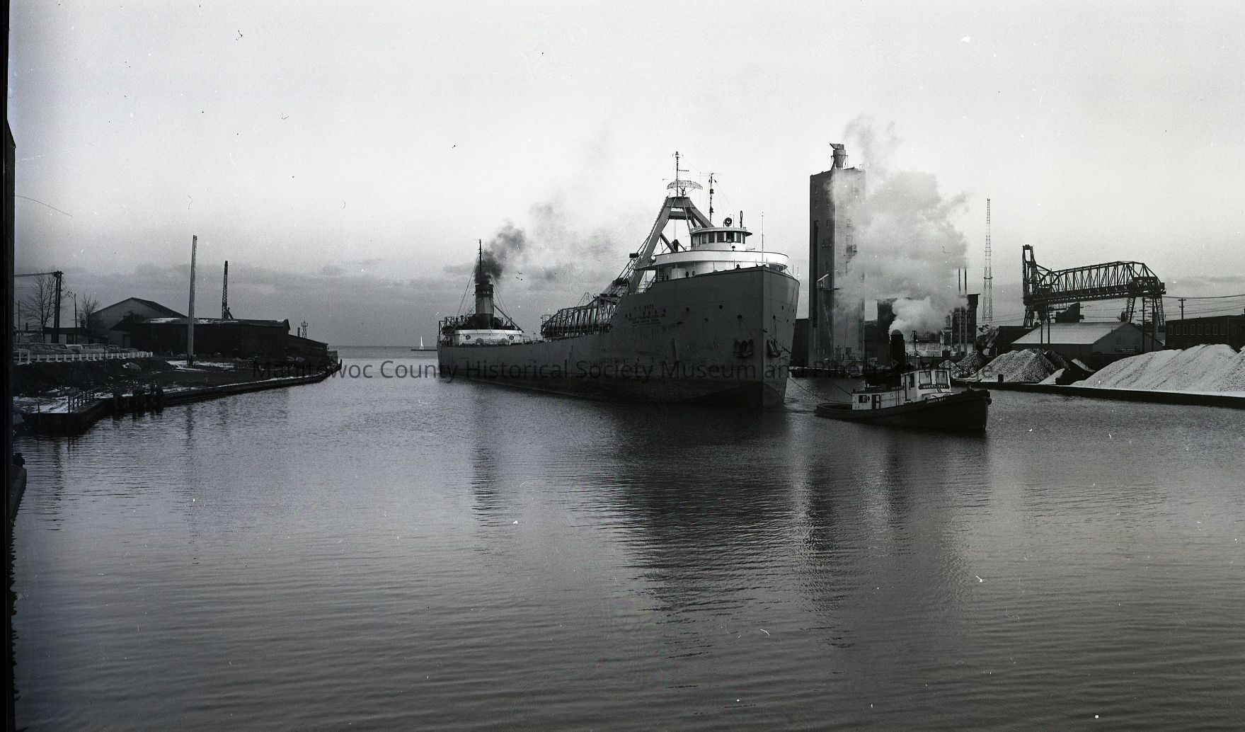 W.F. White being towed upriver past the Budweiser elevator on Quay Street by the Tug Green Bay. Photograph taken December 1st,1954.