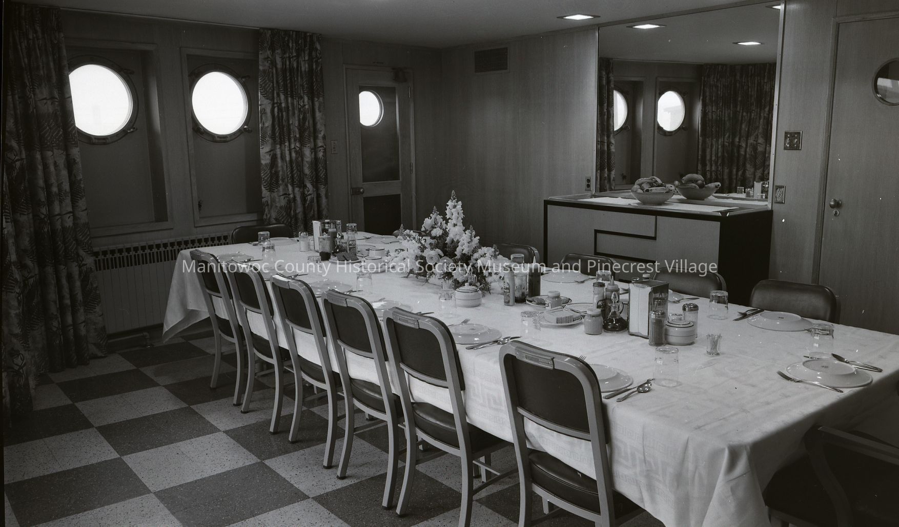 Detroit Edison officer's guest dining room, right after being built at Manitowoc Shipbuilding. Photograph taken on April 13th, 1955.Made/Created
