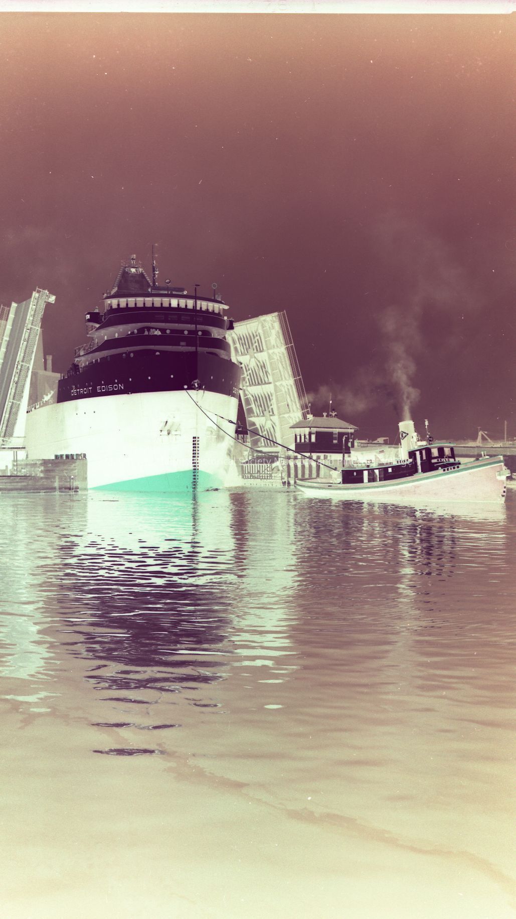 Detroit Edison going through the 10th Street bridge coming up from Manitowoc Shipbuilding where she was just built. Tug Reiss is helping. Photograph taken on April 9th, 1955.Made/Created