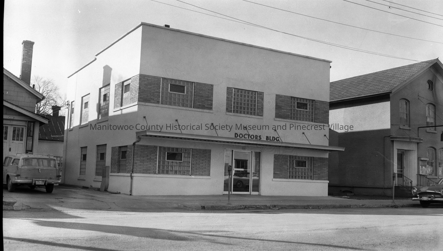 Doctors' Building, 709 Washington Street Manitowoc. Building at left is Saenger Hall, 707 and at right is Fronk Insurance, 713 Washington Street. Photograph taken on January 6th, 1960.Made/Created