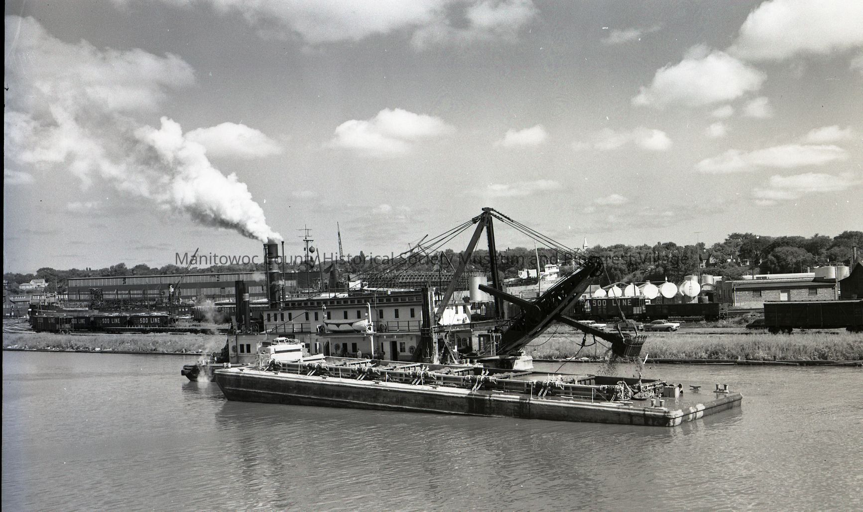 Dredge Kewaunee working in Manitowoc River near Soo Line carferry slip. In the background is crane boat Steel Products docked up river. Photograph taken on September 17th, 1959.Made/Created