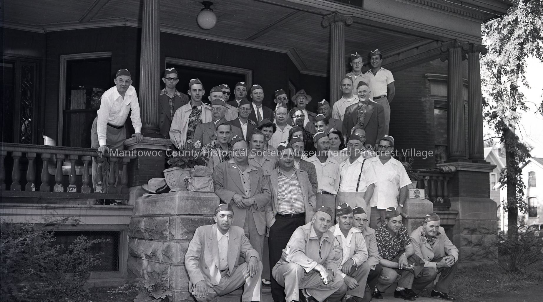 Eagles Club members outside their clubhouse at 823 Hamilton Street Manitowoc. Photograph taken on July 11th, 1952.Made/Created