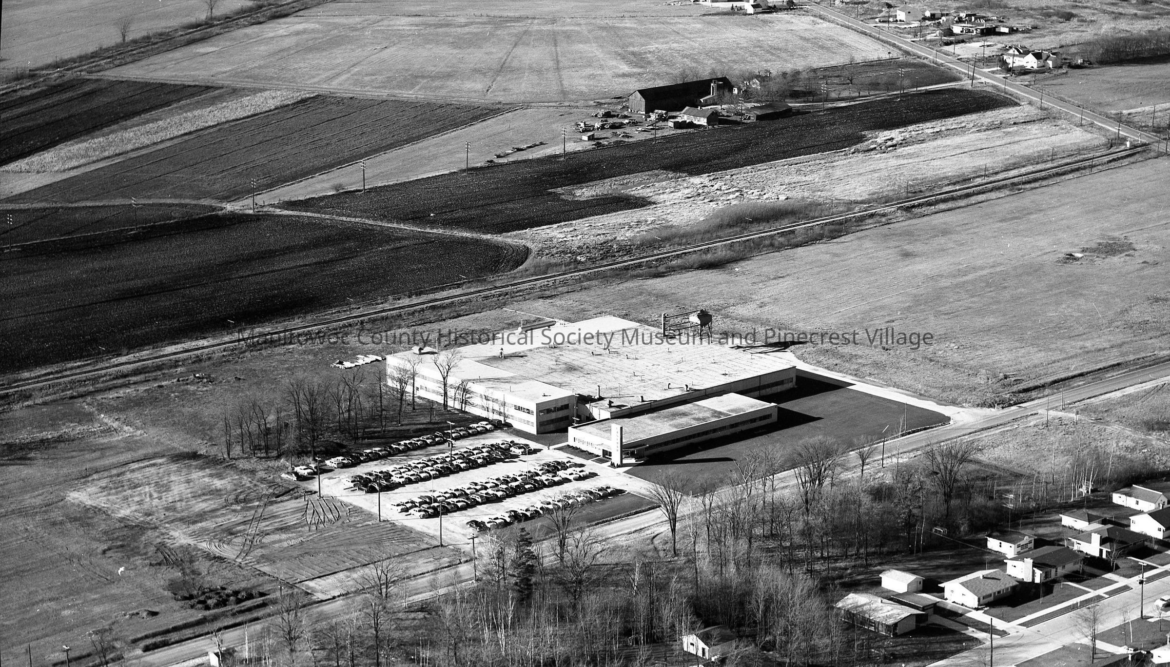 Aerial of Eastman Mfg., 1440 North 24th Street Manitowoc. At bottom are homes on North 23rd and upper right is Menasha Ave. Rail line behind Eastman is C&NW main line to Green Bay. Photograph taken on November 17th, 1958.Made/Created