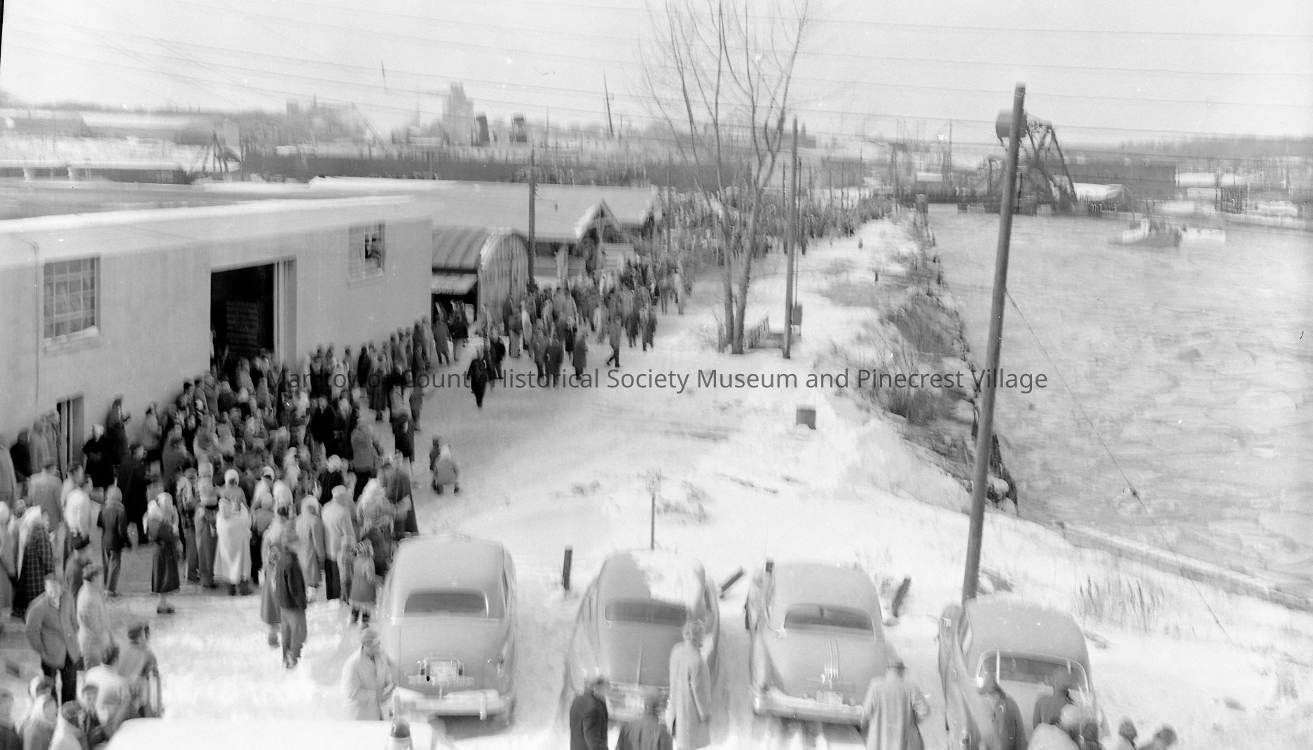 Edward L. Ryerson, last lake boat built at Manitowoc - crowd gathers at west end of Chicago Street for the launch. Railroad jackknife bridge in the background. Photograph taken on January 21st, 1960.Made/Created