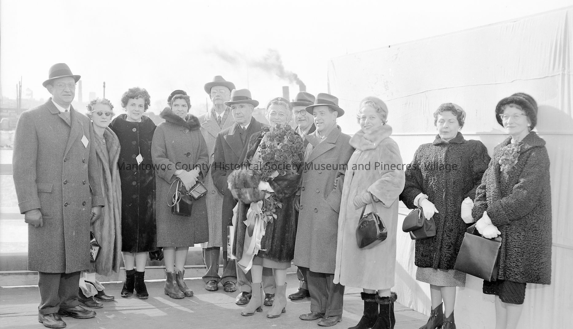 Edward L. Ryerson, last lake boat built at Manitowoc - Inland Steel and Manitowoc Shipbuilding officers ready for launch. Woman with flowers will christen her. Photograph taken on Janaury 21st, 1960.Made/Created