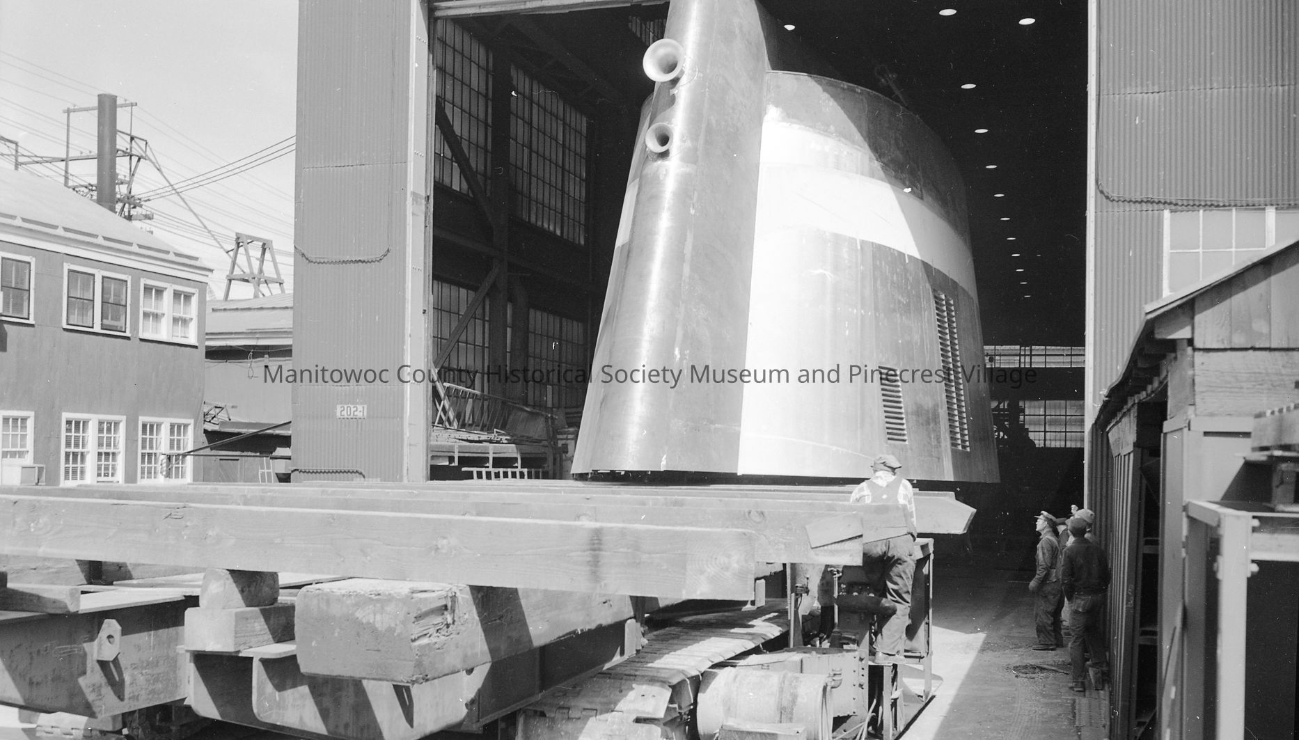 Edward L. Ryerson stainless steel stack is being moved out of the fabrication shop on a crawler. Photograph taken on May 18th, 1960.Made/Created