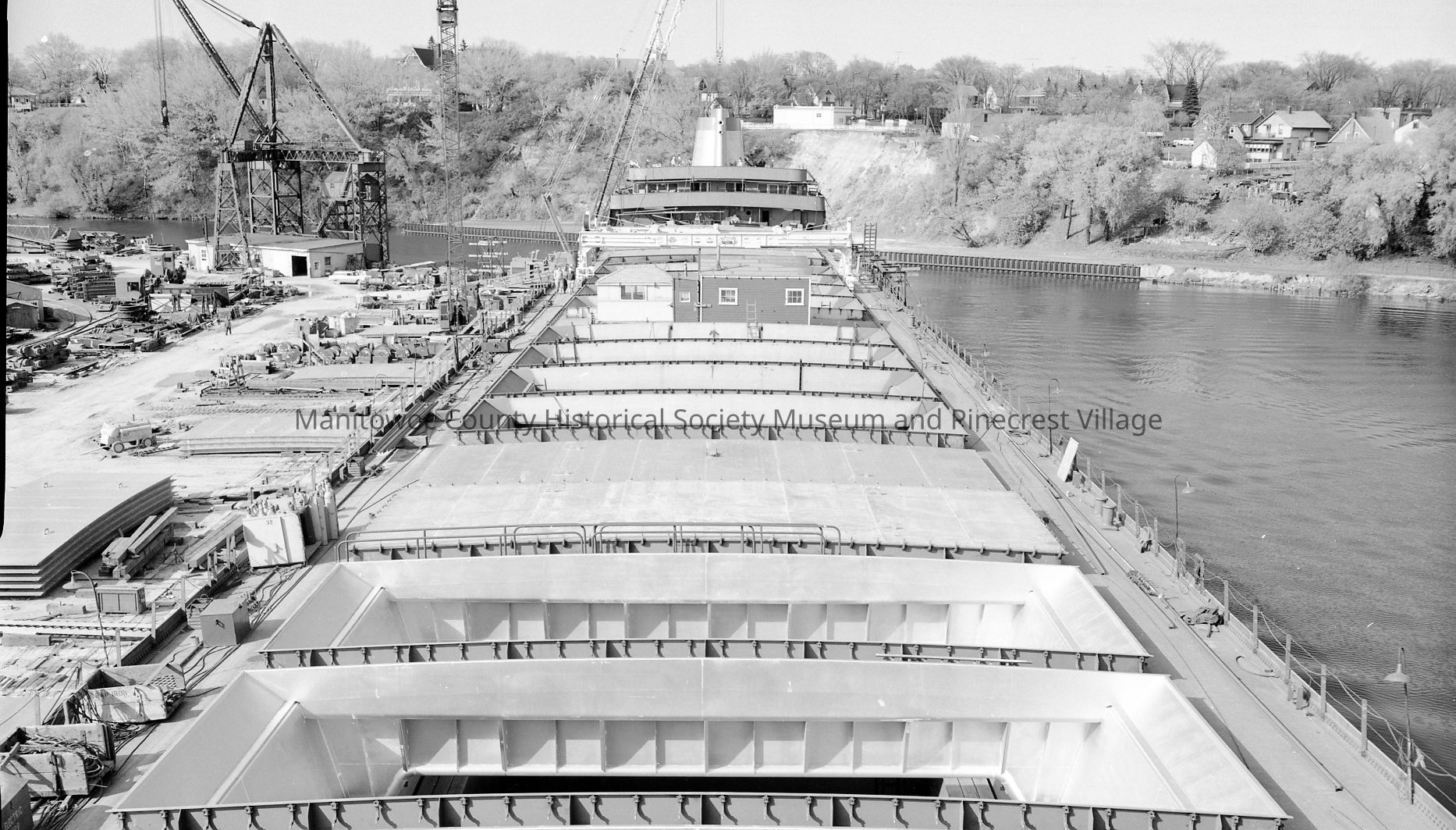 Edward L. Ryerson looking from bow down deck at stack on the stern. In the background on hill is Wagner Pate gas station, 612 North Water Street; homes at right are on North 10th Street. Photograph taken on may 23rd, 1960.Made/Created
