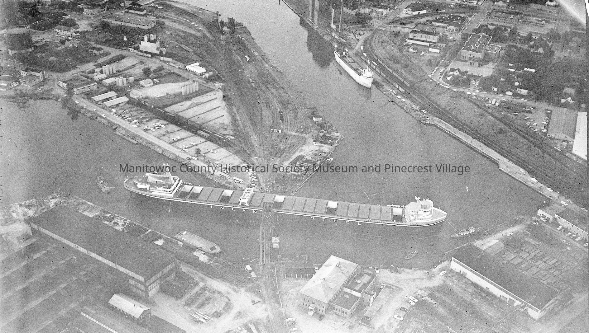 Edward L. Ryerson coming out through Soo Line jackknife bridge. Notice small crane boat docked down river. Photograph taken on July 28th, 1960.Made/Created