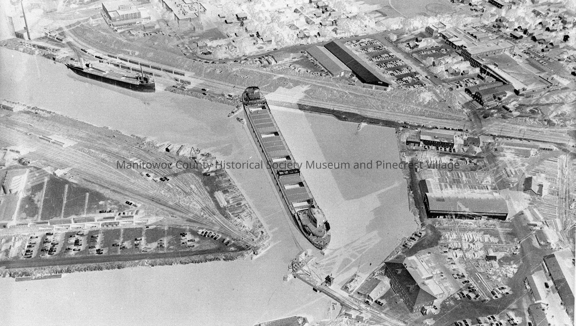 Edward L. Ryerson coming out through the Soo Line jackknife bridge, headed for cut in river bank which was put there to help her turn. Small crane boat docked down river. Photograph taken on July 28th, 1960.Made/Created