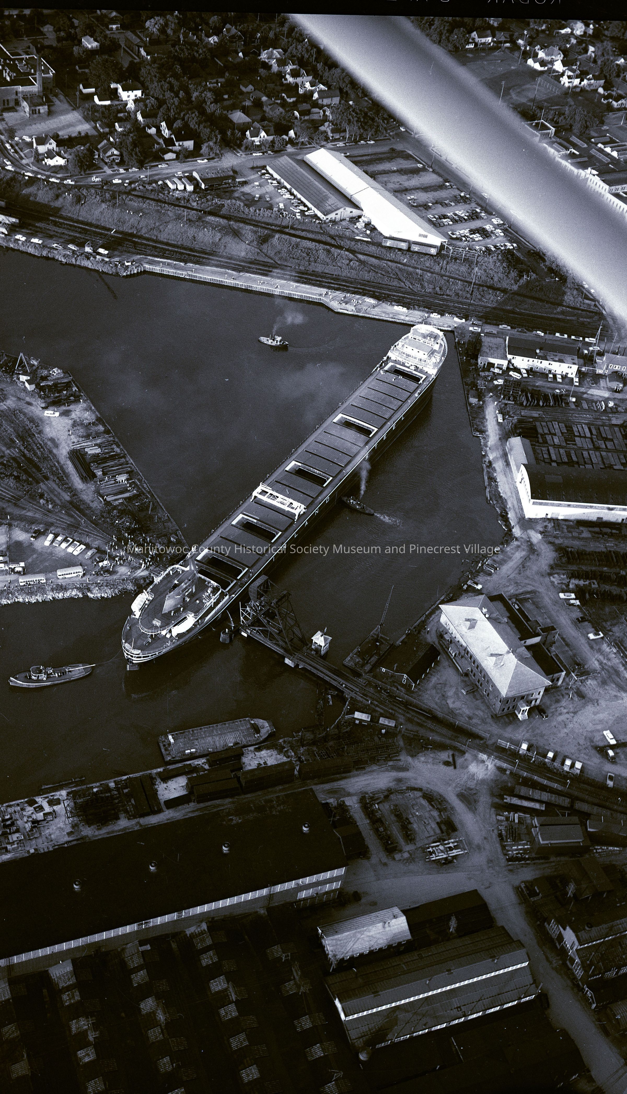 Aerial view of the Edward Ryerson coming out of Manitowoc harbor. This was the last and largest boat built at Manitowoc Shipbuilding. There was a cut made in the south riverbank to slide the bow along so the stern would clear the jack knife railroad bridge. Photograph taken on July 25th, 1960.Made/Created