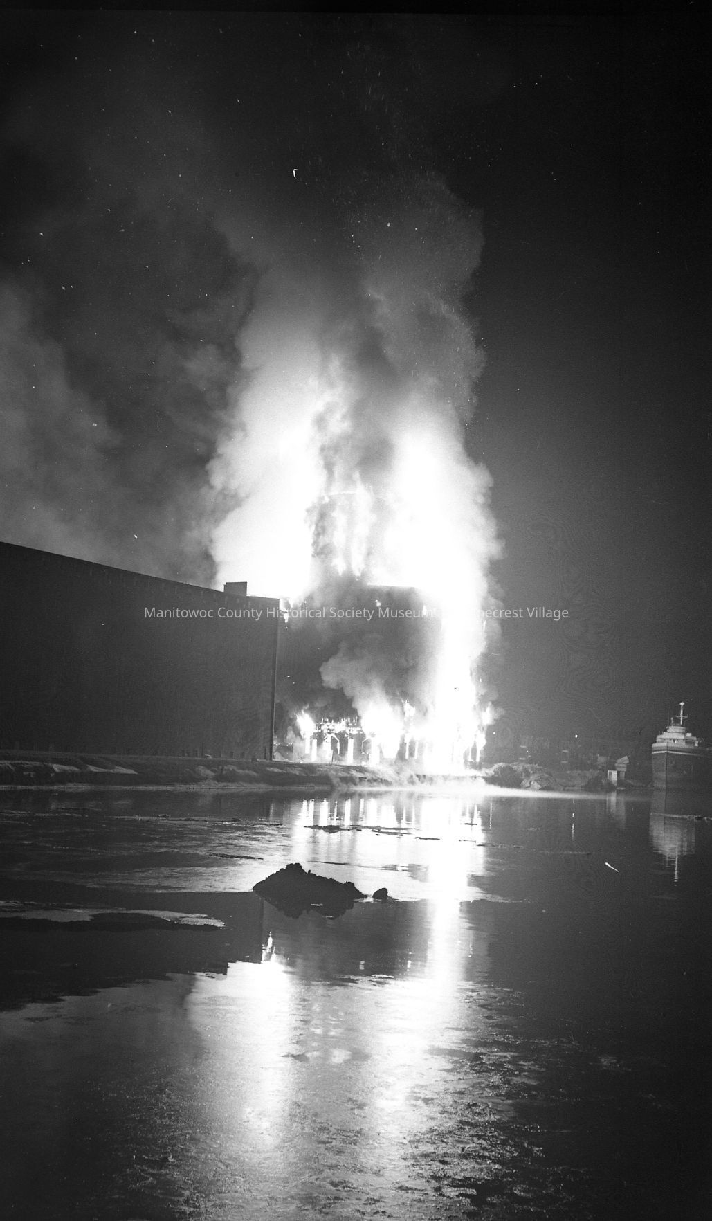 Elevator B fire on South Water Street Manitowoc. Photo taken from 10th Street bridge. Photograph taken on March 25th, 1962.Made/Created