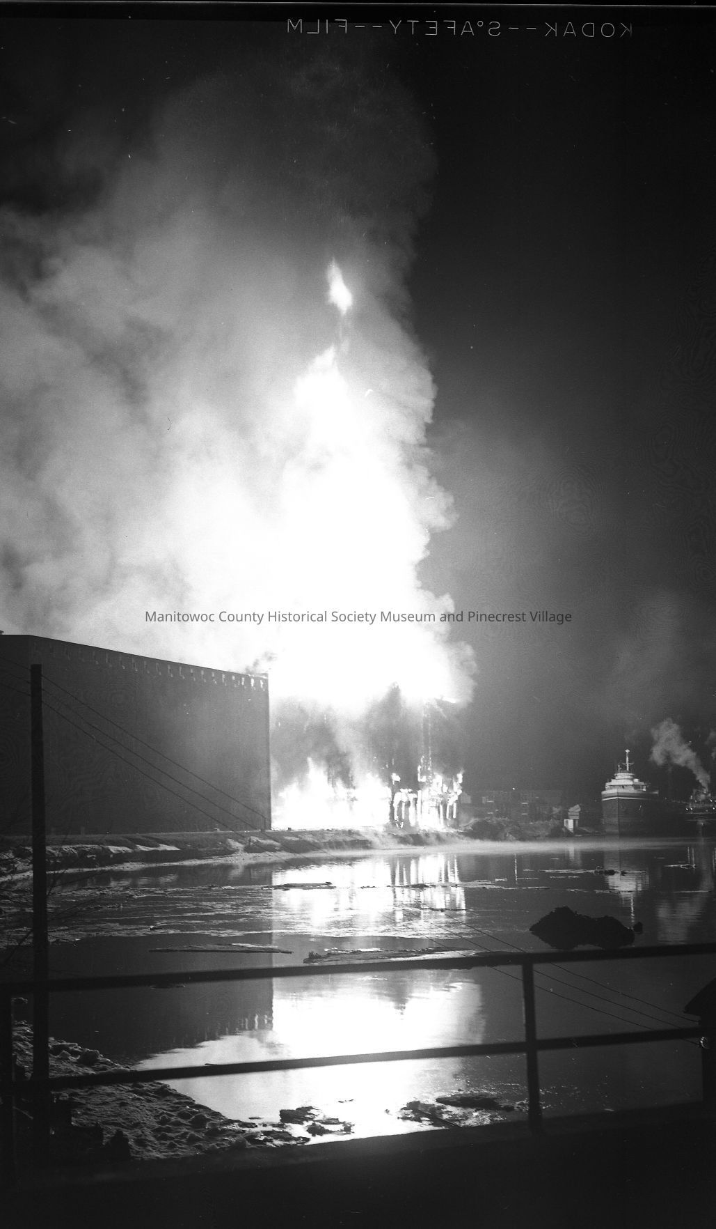 Elevator B fire on South Water Street Manitowoc. Photo taken from 10th Street bridge. Notice lake boats in winter layup. One boat has steam up maybe to move. Photograph taken on March 25th, 1962.Made/Created