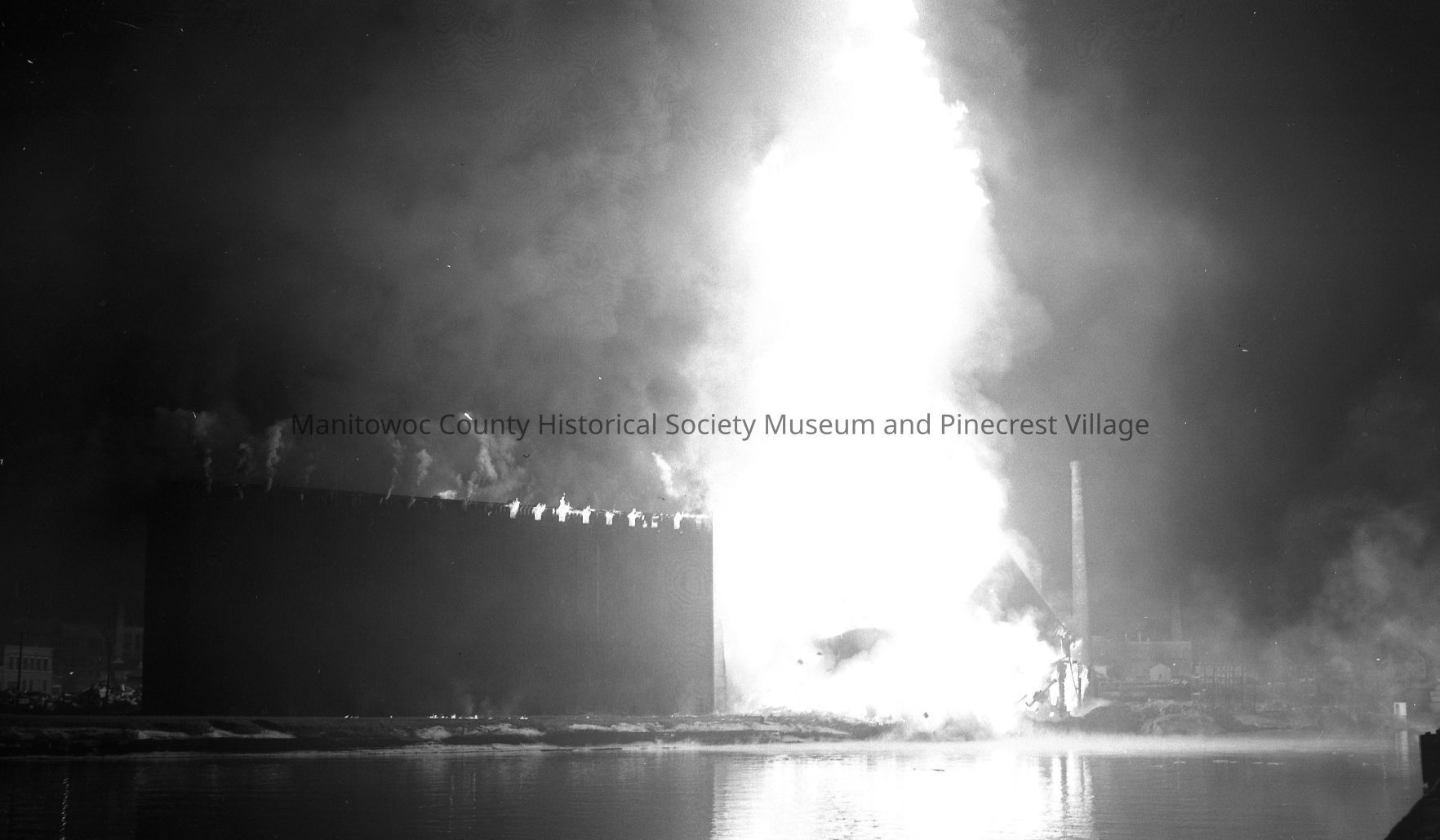 Elevator B fire on South Water Street Manitowoc. Photo taken from 10th Street bridge. Photograph taken on March 25th, 1962.Made/Created
