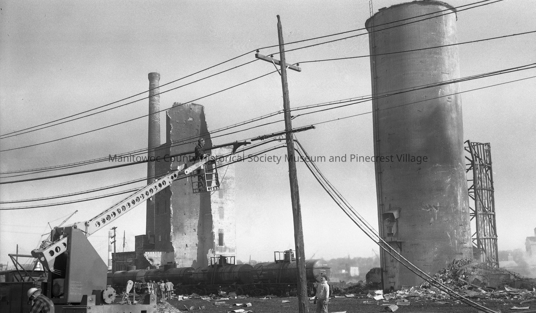 Elevator B fire on South Water Street Manitowoc. This is aftermath looking from 10th Street bridge. Utility crews stringing new wires. Photograph taken on March 27th, 1962.Made/Created
