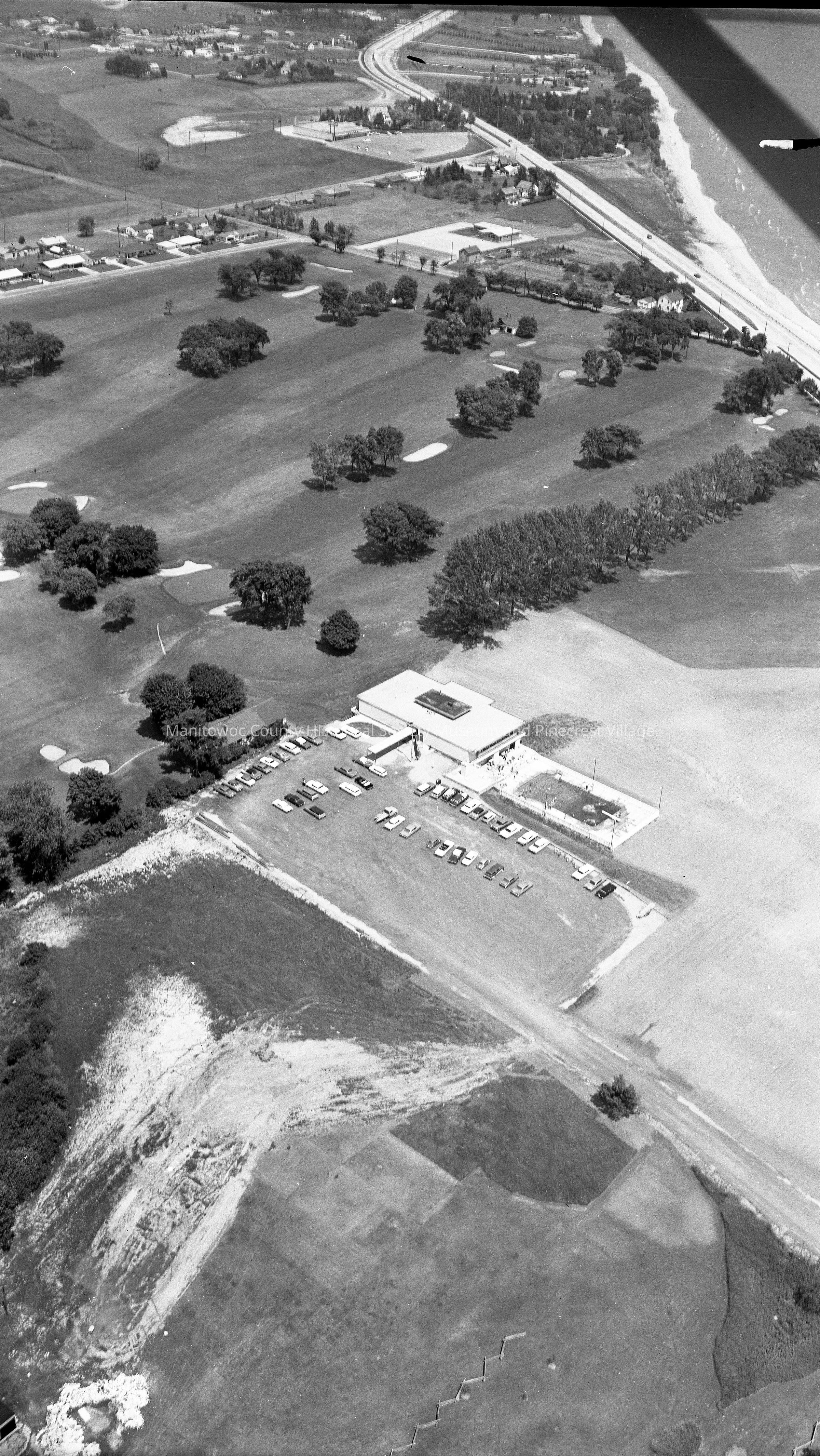 Aerial view of the Elks Club, 200 East Waldo Blvd. Manitowoc. Upper right is intersection of Johnson & Memorial Drive. Upper left is East Park View Lane and East Reed Ave. Knights of Columbus clubhouse is on Johnson Drive. Photograph taken on July 23rd, 1963.Made/Created
