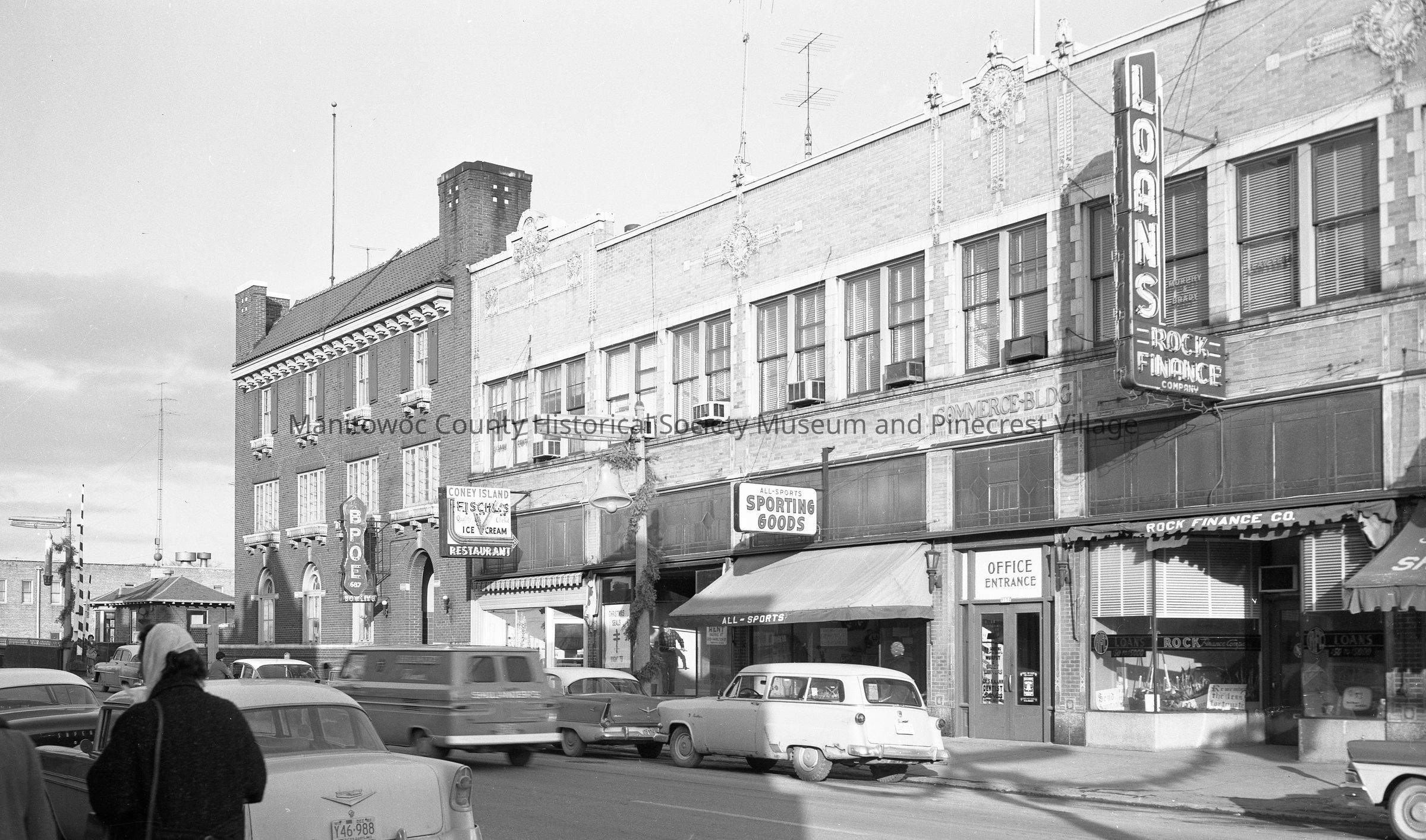 Elks Club and Commerce Building, South 8th Street Manitowoc. Left to right: Elks Club, 809; Coney Island Restaurant, 811; Louie's Sporting Goods, 813; Rock Finance, 817 South 8th Street. Photograph taken in 1963.Made/Created