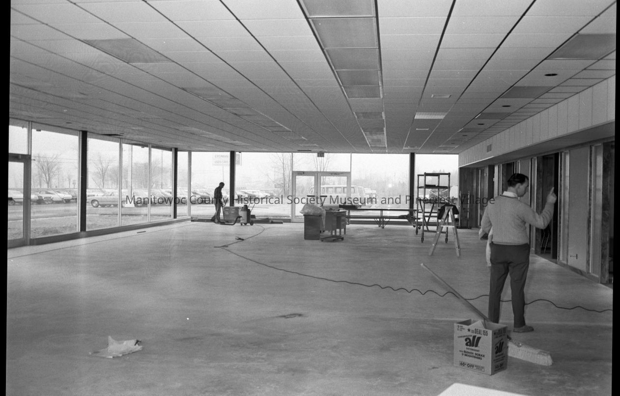 Finishing work on show room floor at new Erdman Ford car dealership on Memorial Drive Manitowoc. Photograph taken on May 15th, 1969.Made/Created