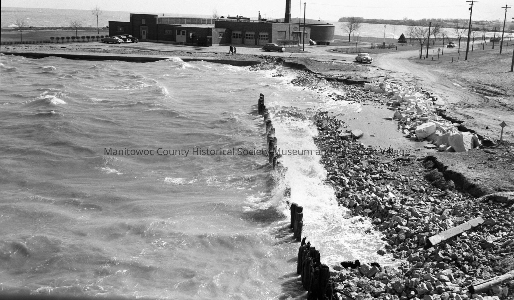 Lakefront erosion between Manitowoc Sewage Treatment Plant and carferry slip where photo was taken looking south. Photograph taken on April 14th, 1952.Made/Created