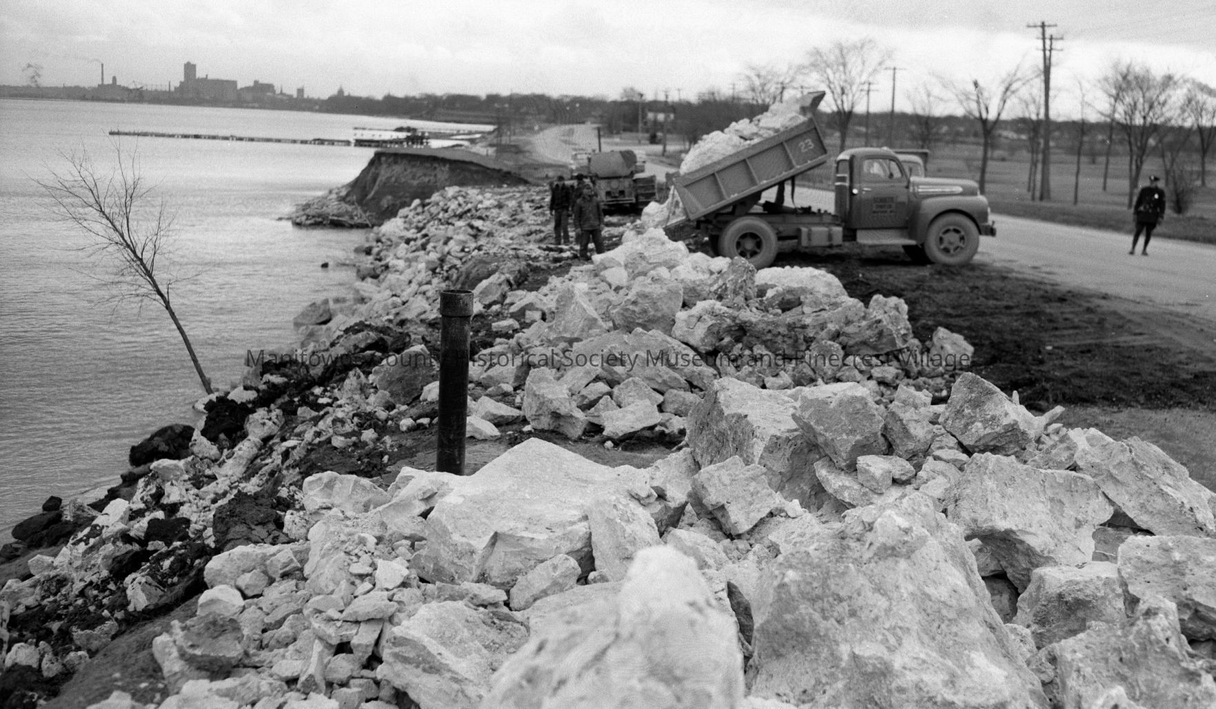 Stone rip-rap being dumped along Memorial Drive near Johnson Drive to slow erosion. Looking south toward Waldo Blvd. Photograph taken on April 3rd, 1952.Made/Created
