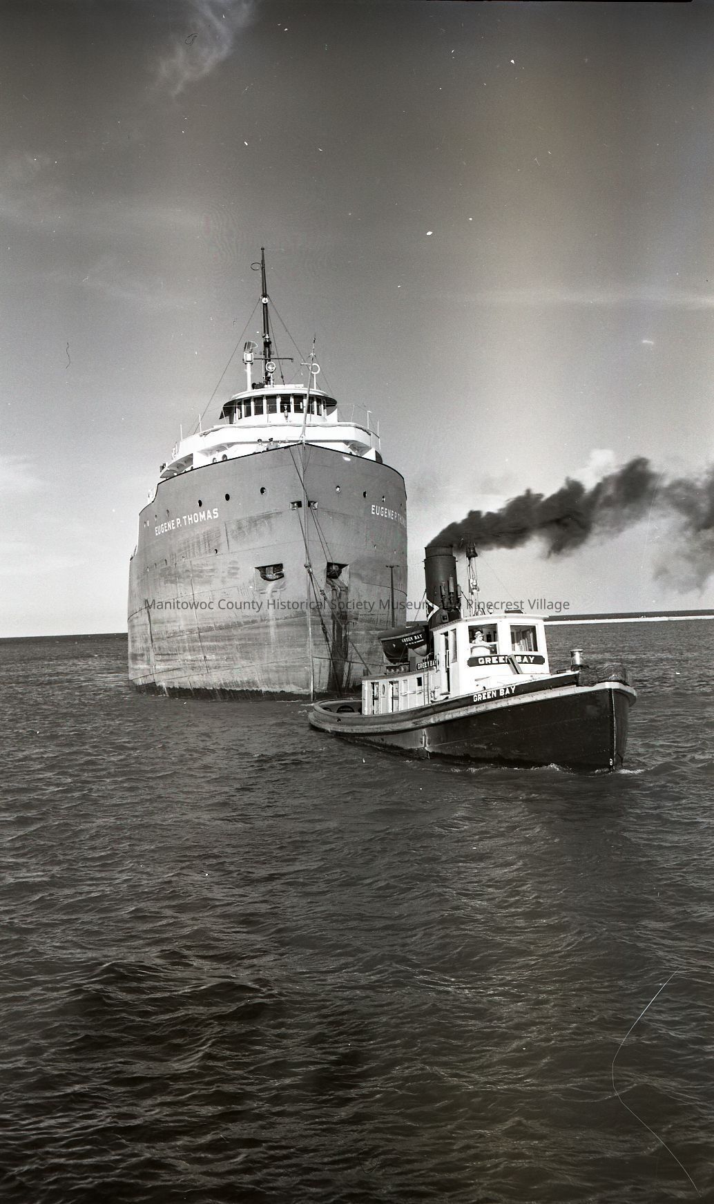 Eugene P. Thomas being towed into Manitowoc by the tug Green Bay. Photograph taken on July 4th, 1956.