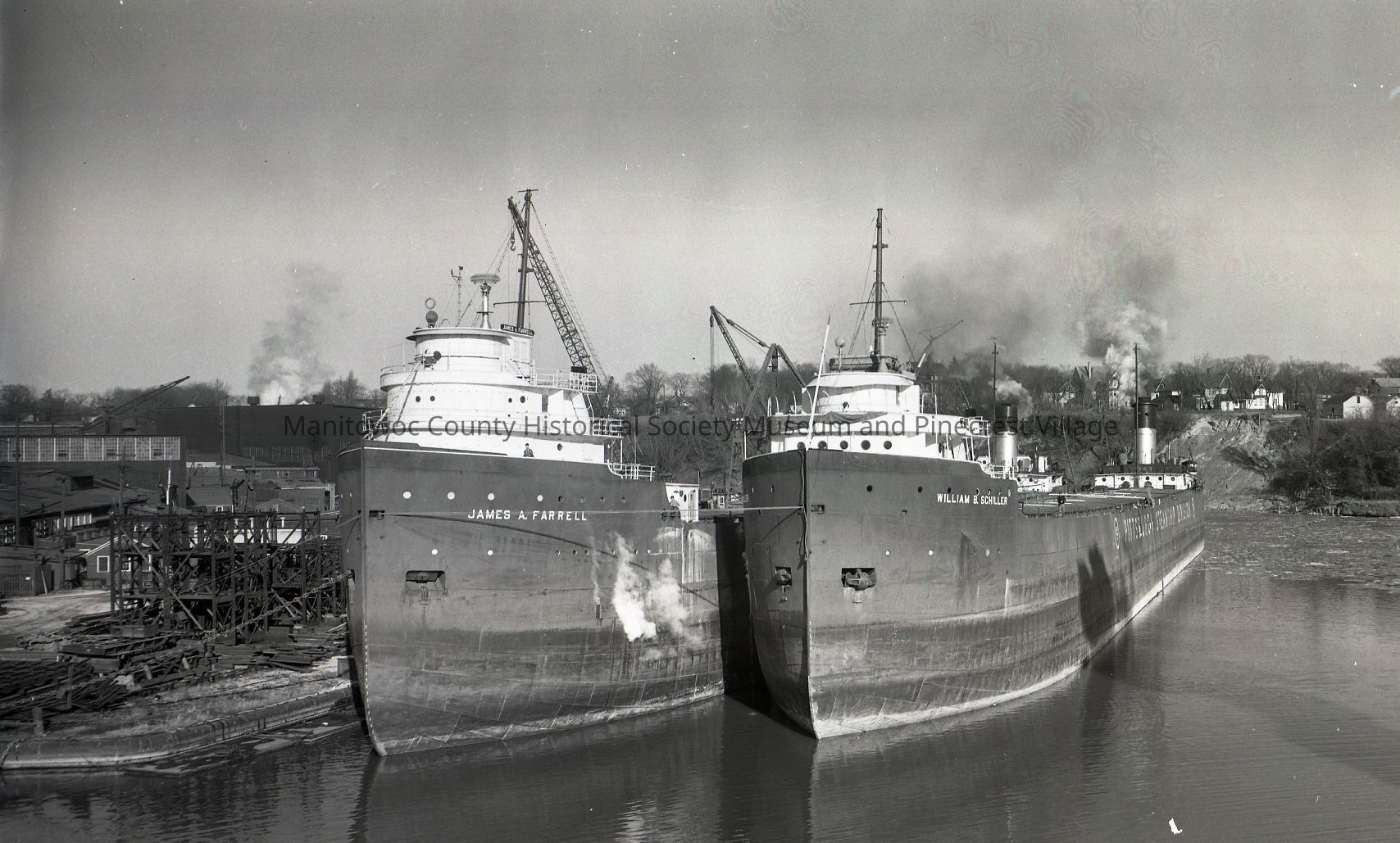 James A. Farrell & William B. Schiller in winter lay-up at Manitowoc Shipbuilding. At right are homes along North 10th Street. Photograph taken on December 4th, 1961.Made/Created