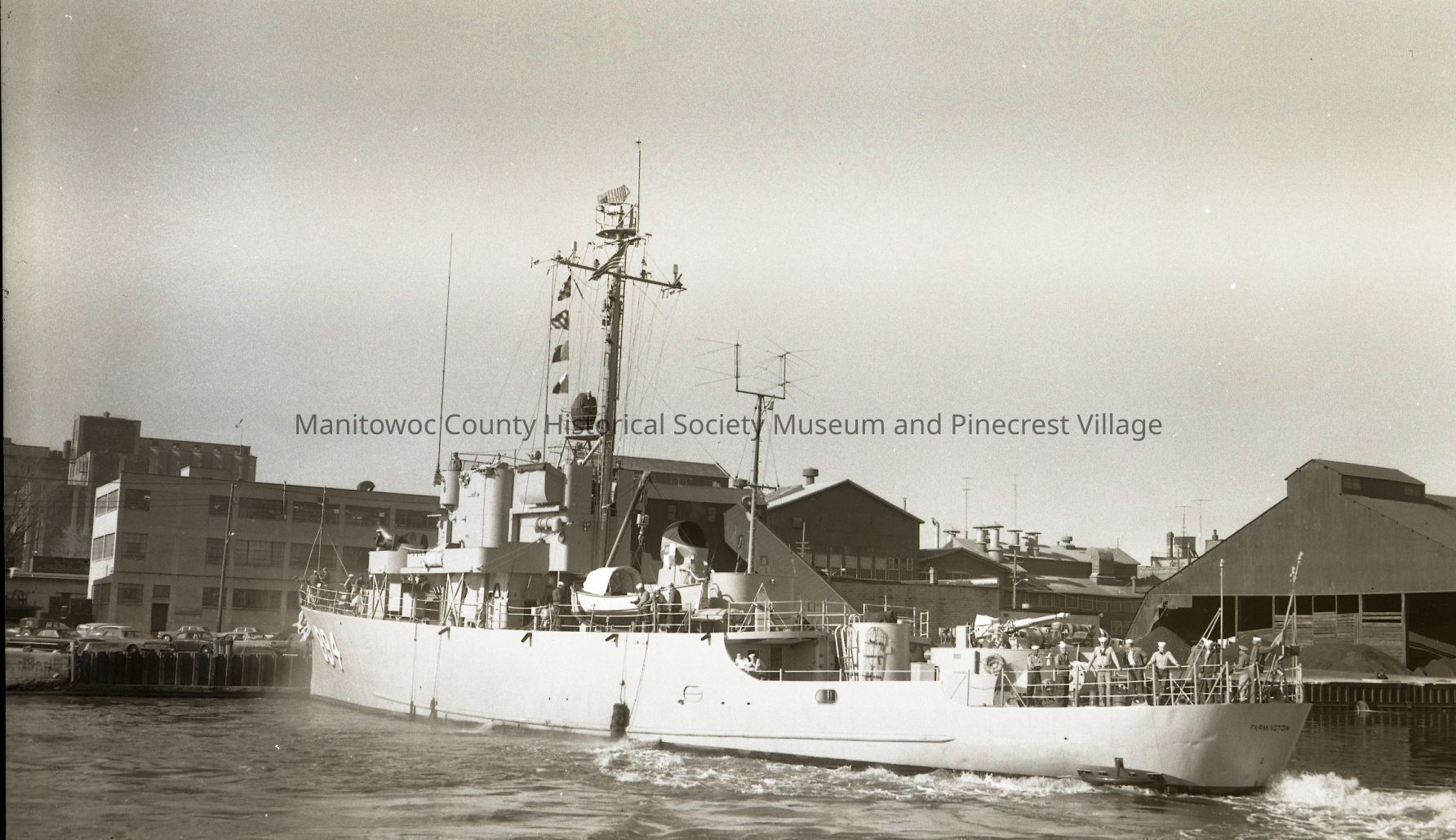 Navy ship Farmington 894 docked by Spindler coal shed along Quay Street. Photograph taken in 1964.