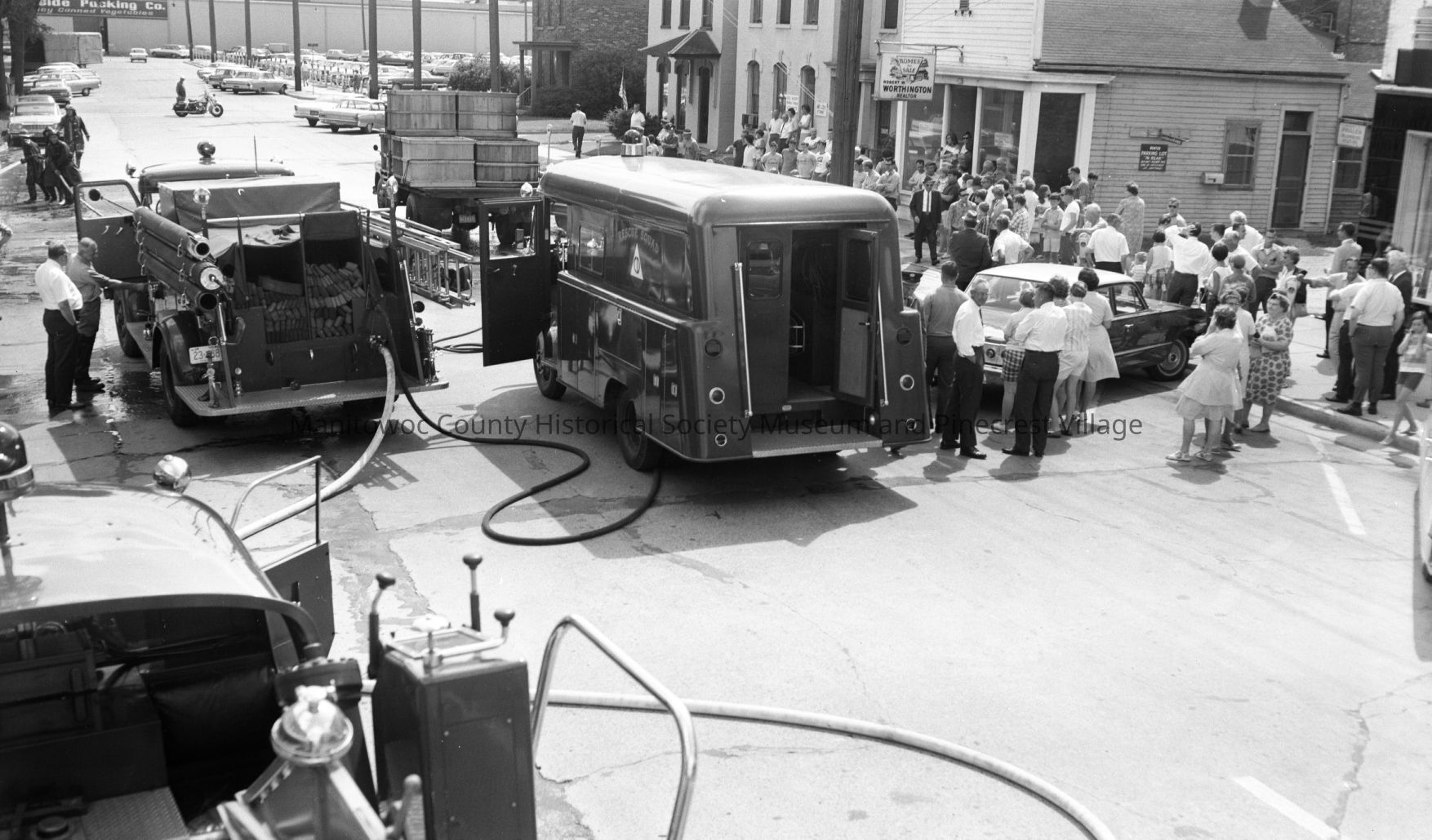 Fire at 700 block of Franklin Street Manitowoc. Buildings from right are Fabric Mart, 719; Worthington Realtor, 713; 709, 707 Franklin Street. Circa 1964.Made/Created