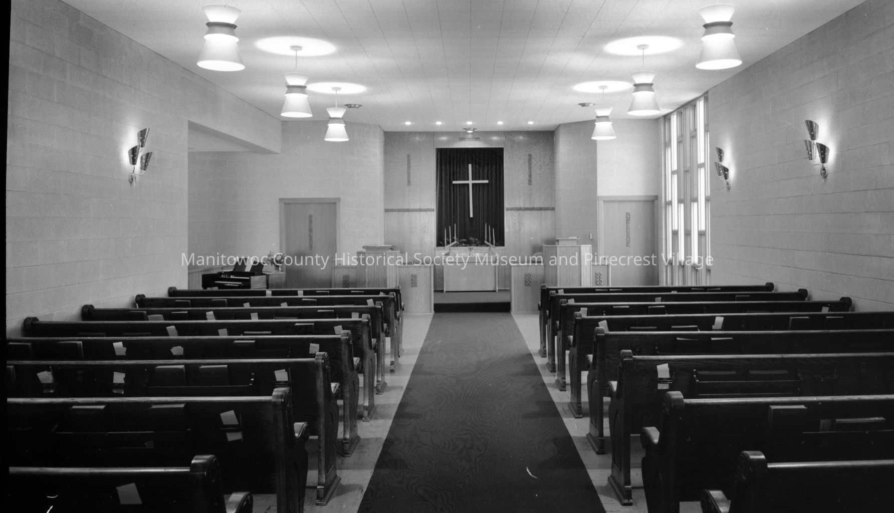 First Baptist Church, 1019 Waldo Blvd Manitowoc; looking toward altar. Photograph taken on October 12th, 1961.Made/Created