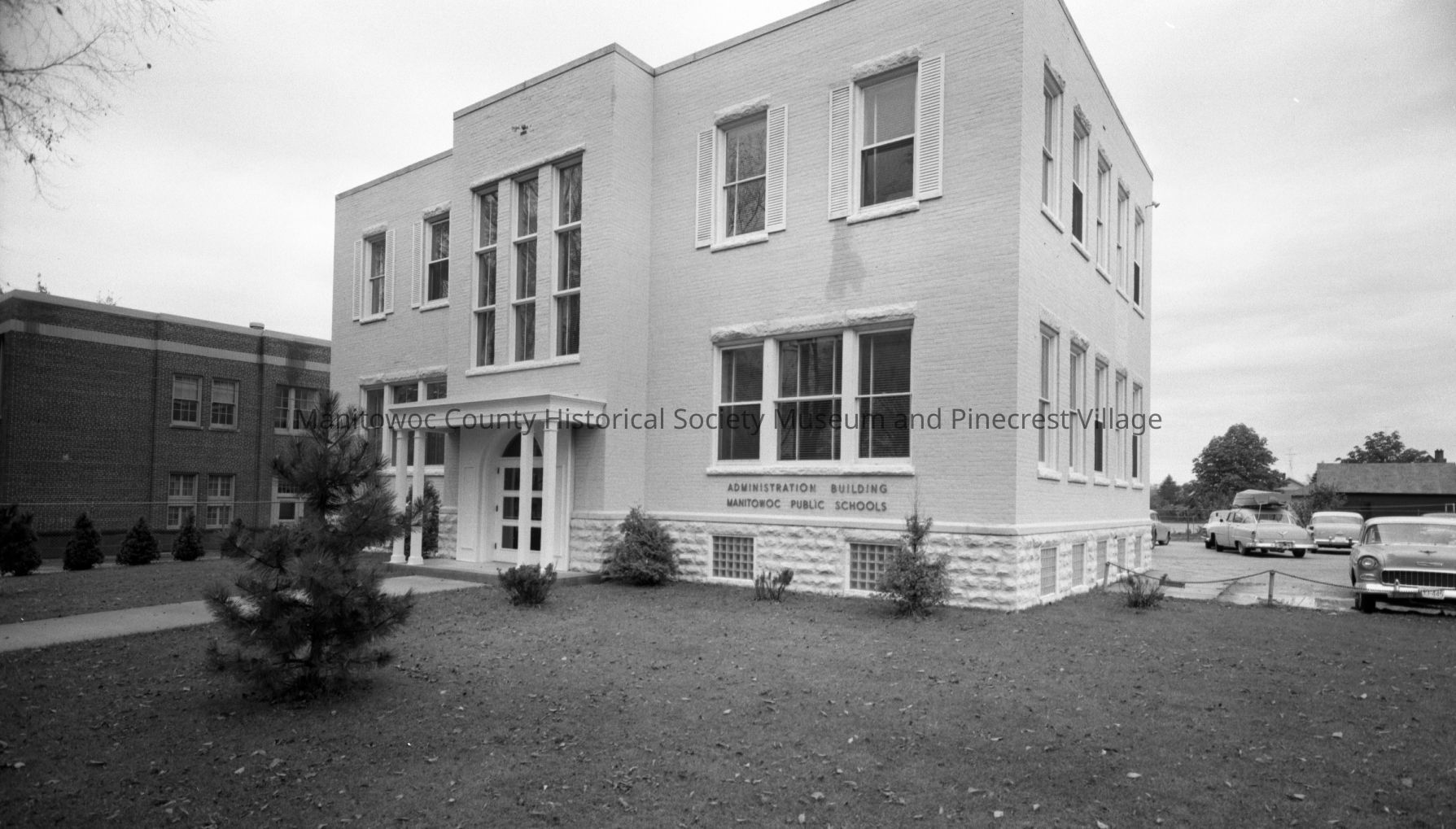 School - First Jefferson School, 1514 South 14th Street Manitowoc. At left is the second school, 1402 Manila Street. First school is administration building. Photograph taken in 1958.Made/Created
