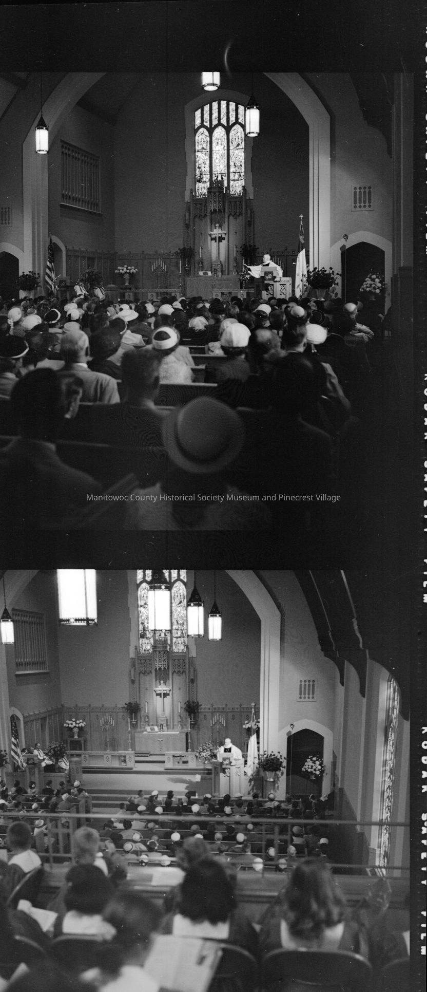 First Lutheran church, 521 North 8th Street Manitowoc; first service. Photograph taken in 1953.