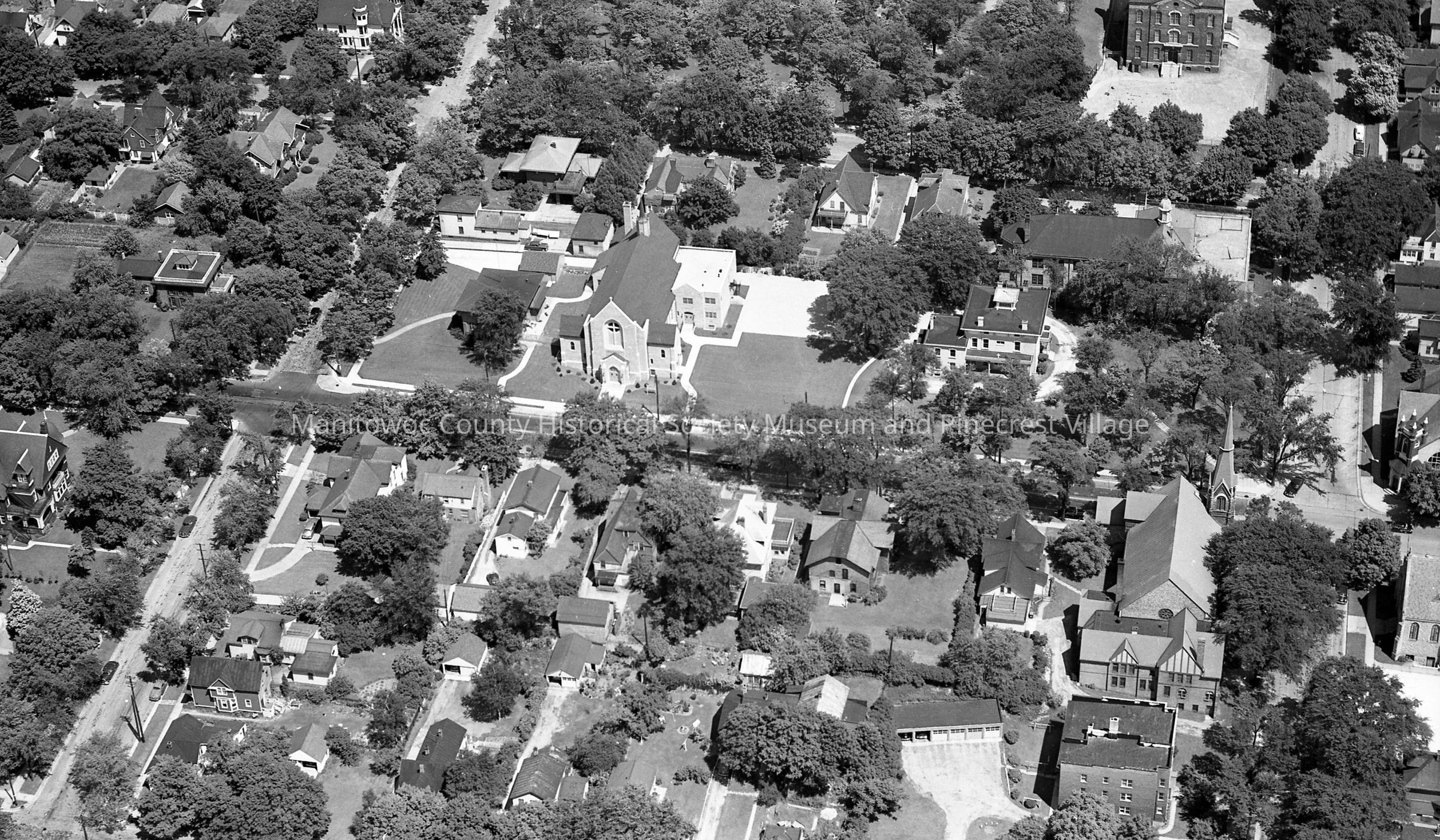 Aerial: First Lutheran Church, 521 North 8th Manitowoc. Right is old Platt family home, 507 North 8th. Behind is Sacred Heart Catholic Church, 702 State Street and old Madison School, 610 State Street. Wooded area left of school is Union Park and left of park is Christian Science Church, 620 Park Street.