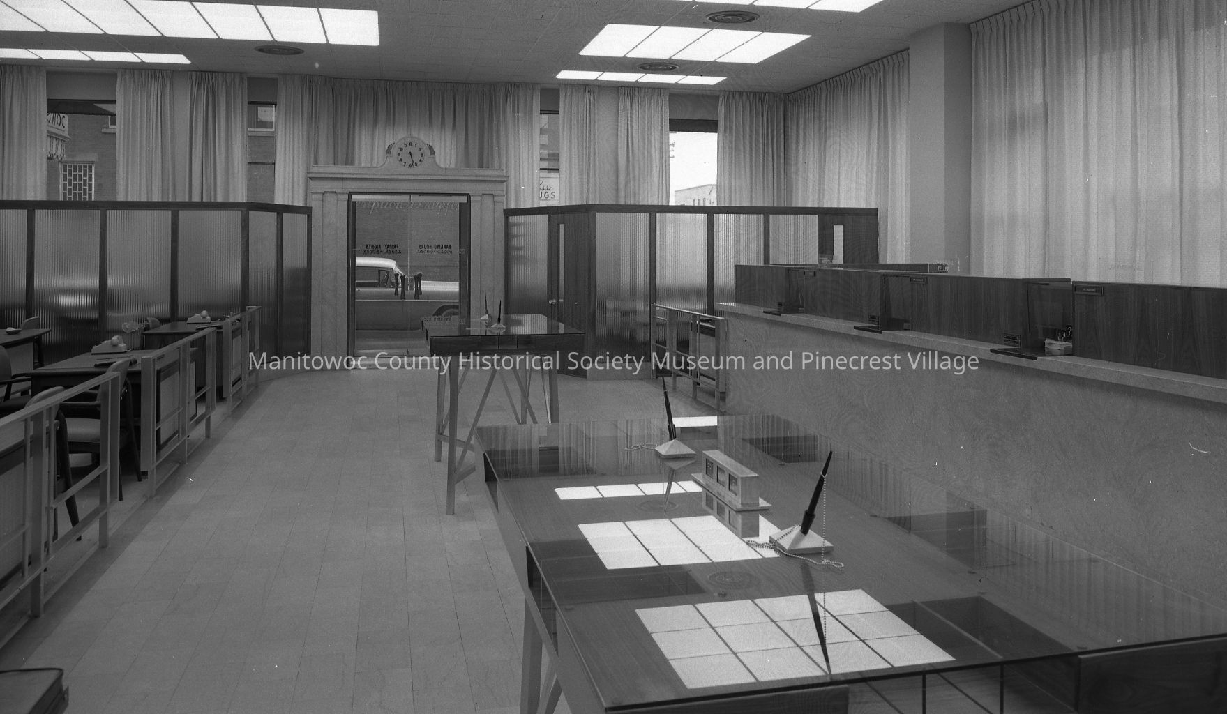 Interior of remodeled First National Bank 202 North 8th Street Manitowoc looking towards front door. Photograph taken on May 5th, 1960.Made/Created
